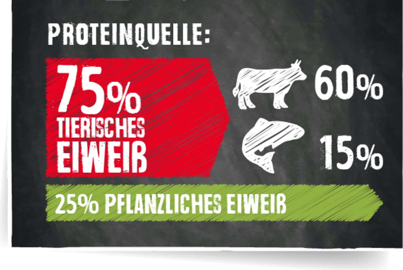 40 % bœuf frais, 18 % amarante, fécule de pomme de terre, 12,5 % protéines de bœuf (séchées), farine de pois, 2,5 % farine de poisson de mer, Zooplancton marin moulu, levure de bière inactivée et séchée, farine de caroube séchée, tourteau de pépins de raisin, phosphate dicalcique, pulpe de betterave séchée désucrée, huile de saumon, huile de carthame, levure hydrolysée, graines de chia, chlorure de sodium, Kaliumchlorid, herbes séchées, Yucca schidigera