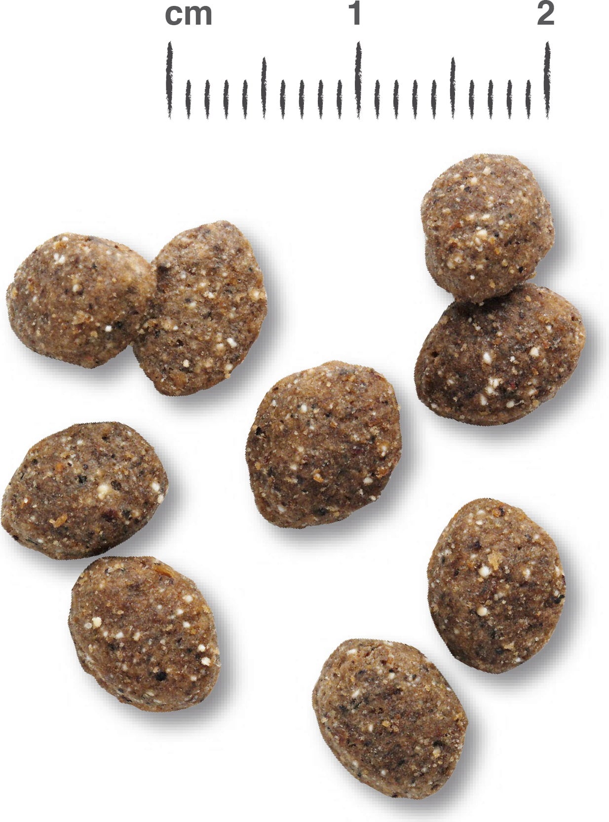 20 % amarante, fécule de pomme de terre, farine de pois, Zooplancton marin moulu (10 % krill), phosphate dicalcique, levure de bière séchée, pulpe de betterave séchée désucrée, farine de caroube séchée, graisse de volaille, huiles végétales, tourteau de pépins de raisin, 2,5 % graines de chia, saumon hydrolysé, carbonate de calcium, chlorure de sodium, Kaliumchlorid, herbes séchées, Yucca schidigera