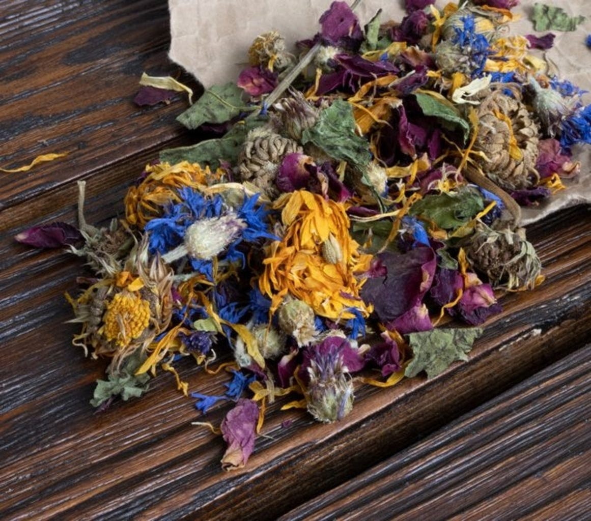 40 % fleurs de souci entières, 25 % pétales de rose, bleuet bleu, echinacea