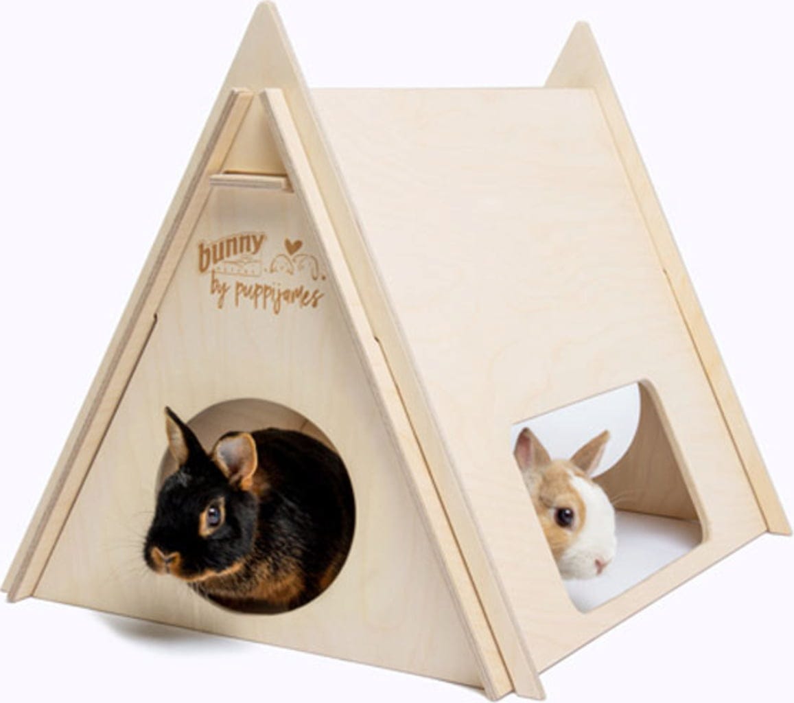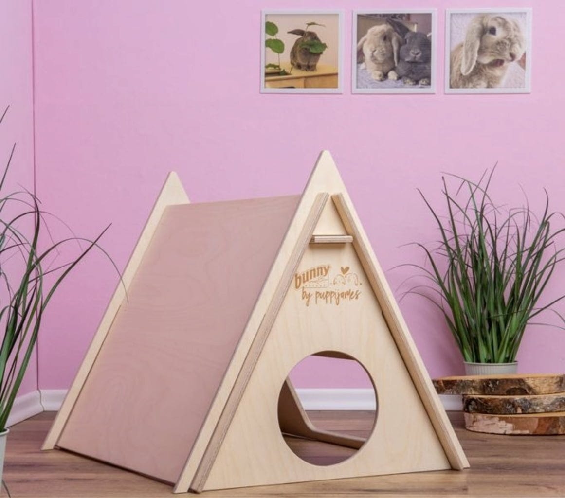 Ce lit tente en bois naturel offre à vos lapins nains un refuge indispensable, tout en apportant une touche décorative à leur habitat. Véritable élément phare de l’enclos, il peut accueillir confortablement jusqu’à deux animaux et constitue un espace idéal pour se reposer, jouer et se blottir.