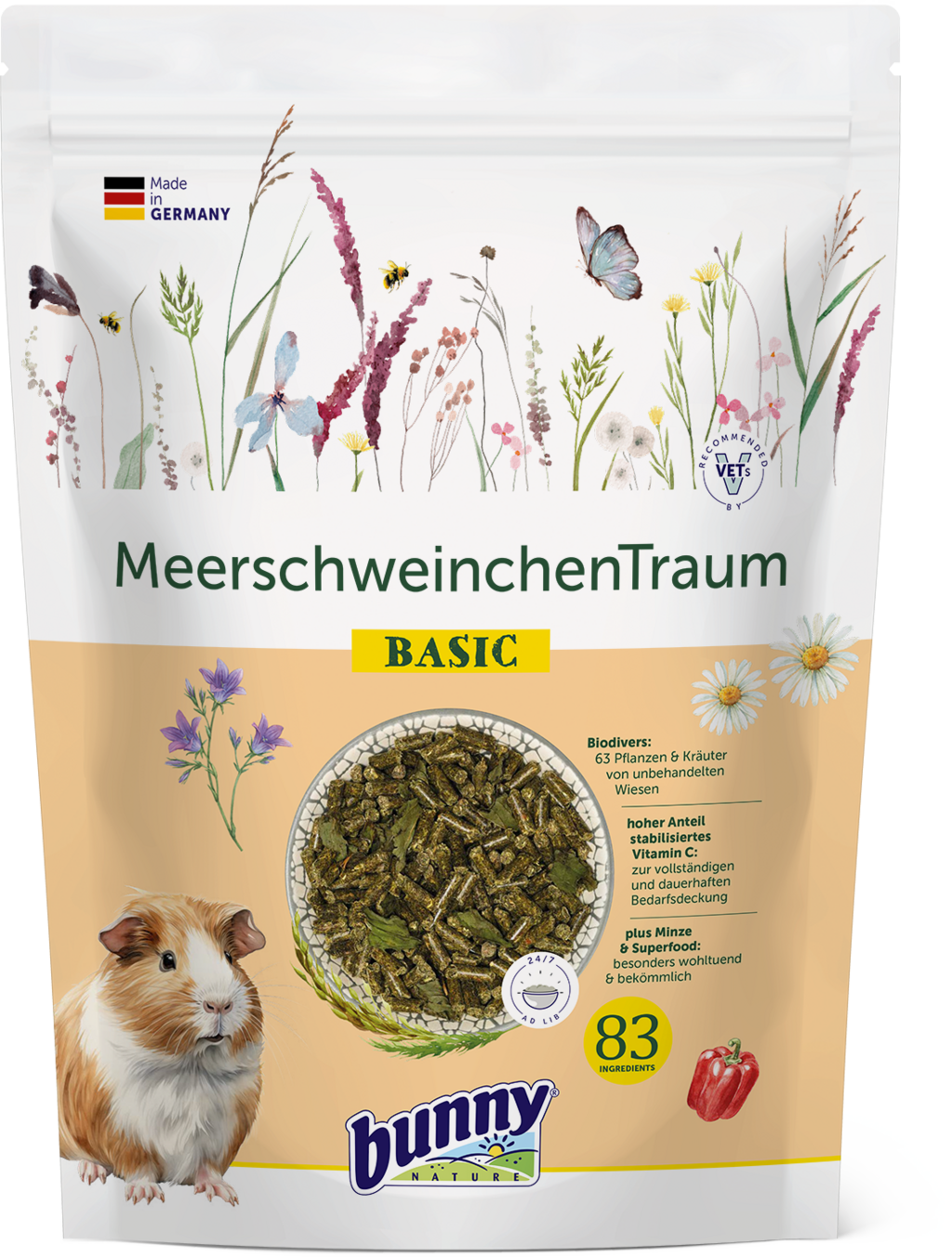 Quand les rêves des cochons d’Inde deviennent réalité… cet aliment savoureux n’est jamais bien loin ! Avec 63 plantes différentes issues de prairies non traitées, de la vitamine C stabilisée ainsi que de la menthe, du quinoa, de l’amarante, des baies d’aronia et de la maca, il apporte une délicieuse variété dans la gamelle et permet une alimentation de haute qualité, adaptée à l’espèce de vos compagnons à quatre pattes.