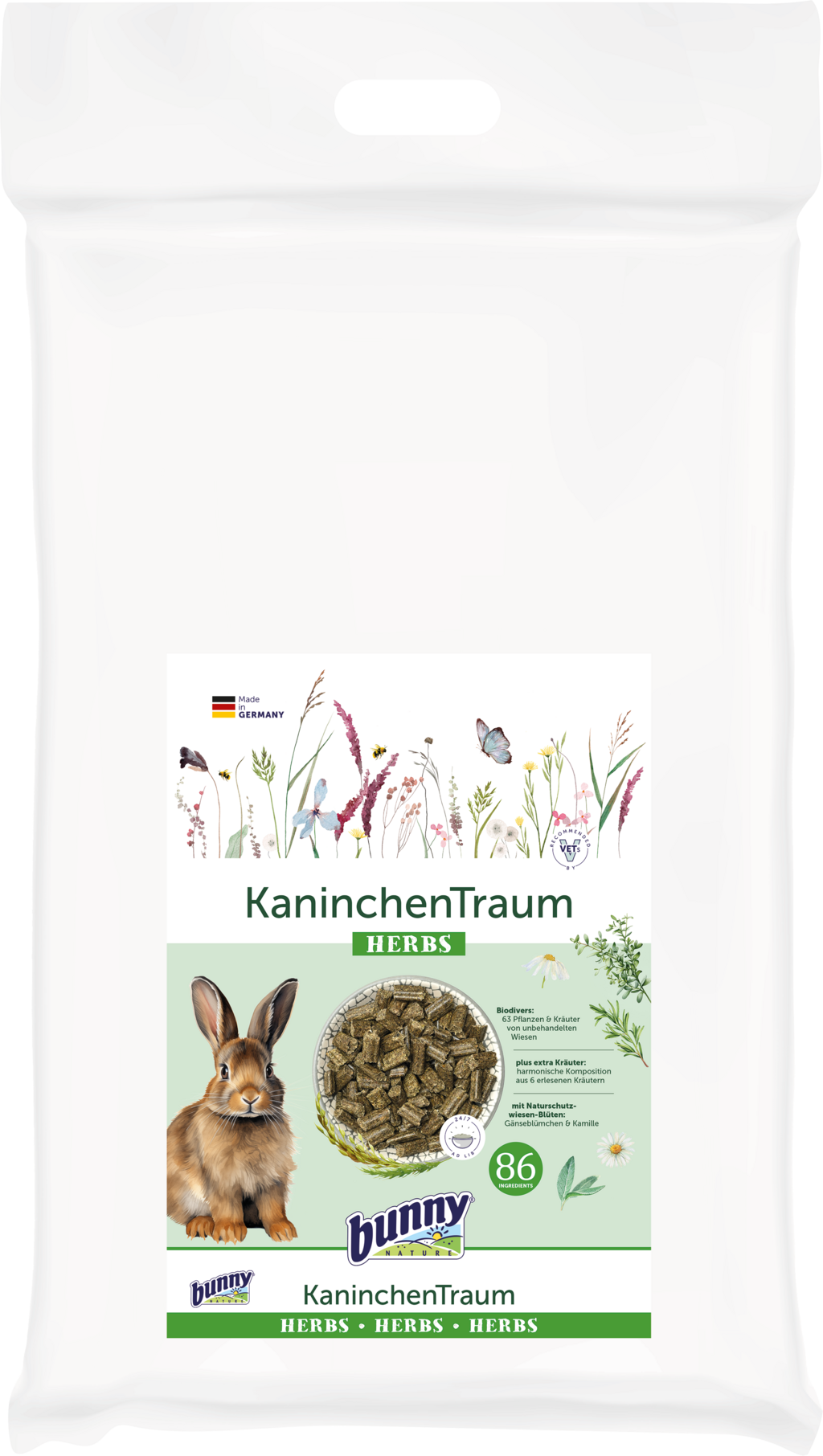 Quand les rêves des lapins deviennent réalité… cet aliment savoureux n’en est vraiment pas loin ! Avec 63 plantes différentes issues de prairies non traitées et de la précieuse inuline, il offre dès le départ une délicieuse diversité et permet une alimentation de grande qualité, parfaitement adaptée aux besoins des jeunes lapins nains.