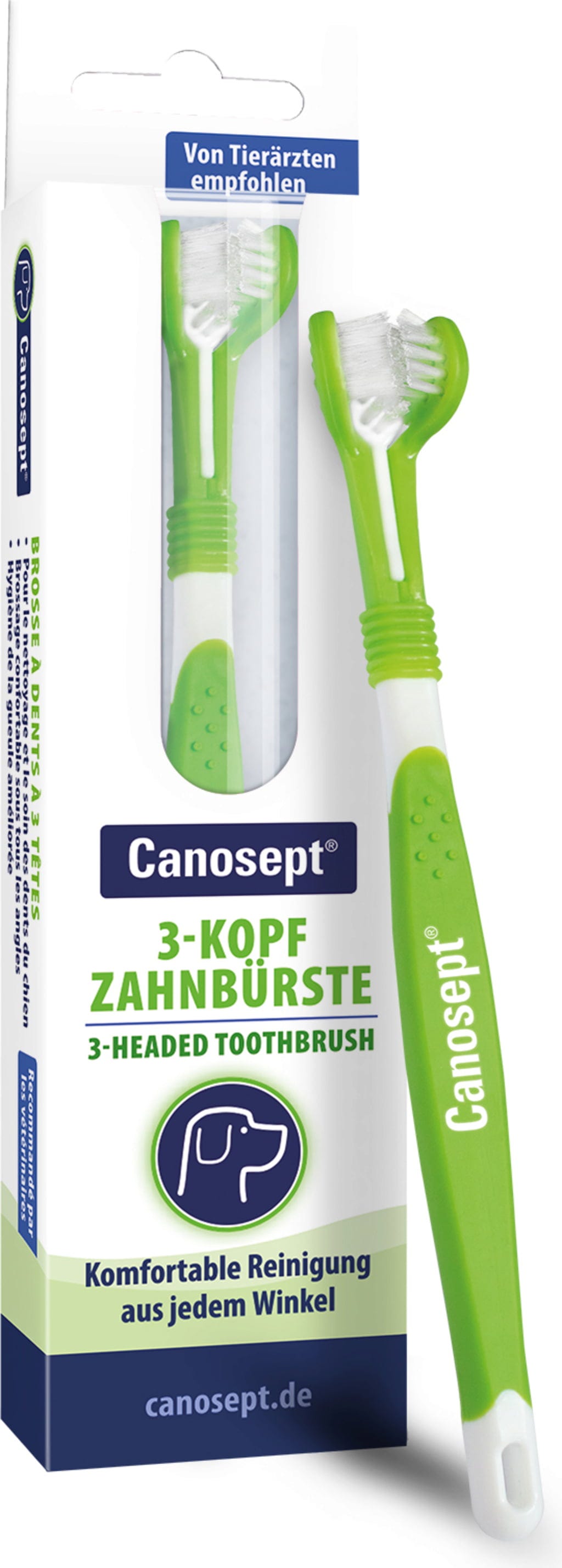Grâce à son design spécifique, la brosse à dents à 3 têtes pour chiens de Canosept permet d’atteindre même les zones les plus difficiles de la bouche. Les dents sont nettoyées de la surface de mastication aux côtés, jusqu’aux gencives, sans oublier aucune zone.