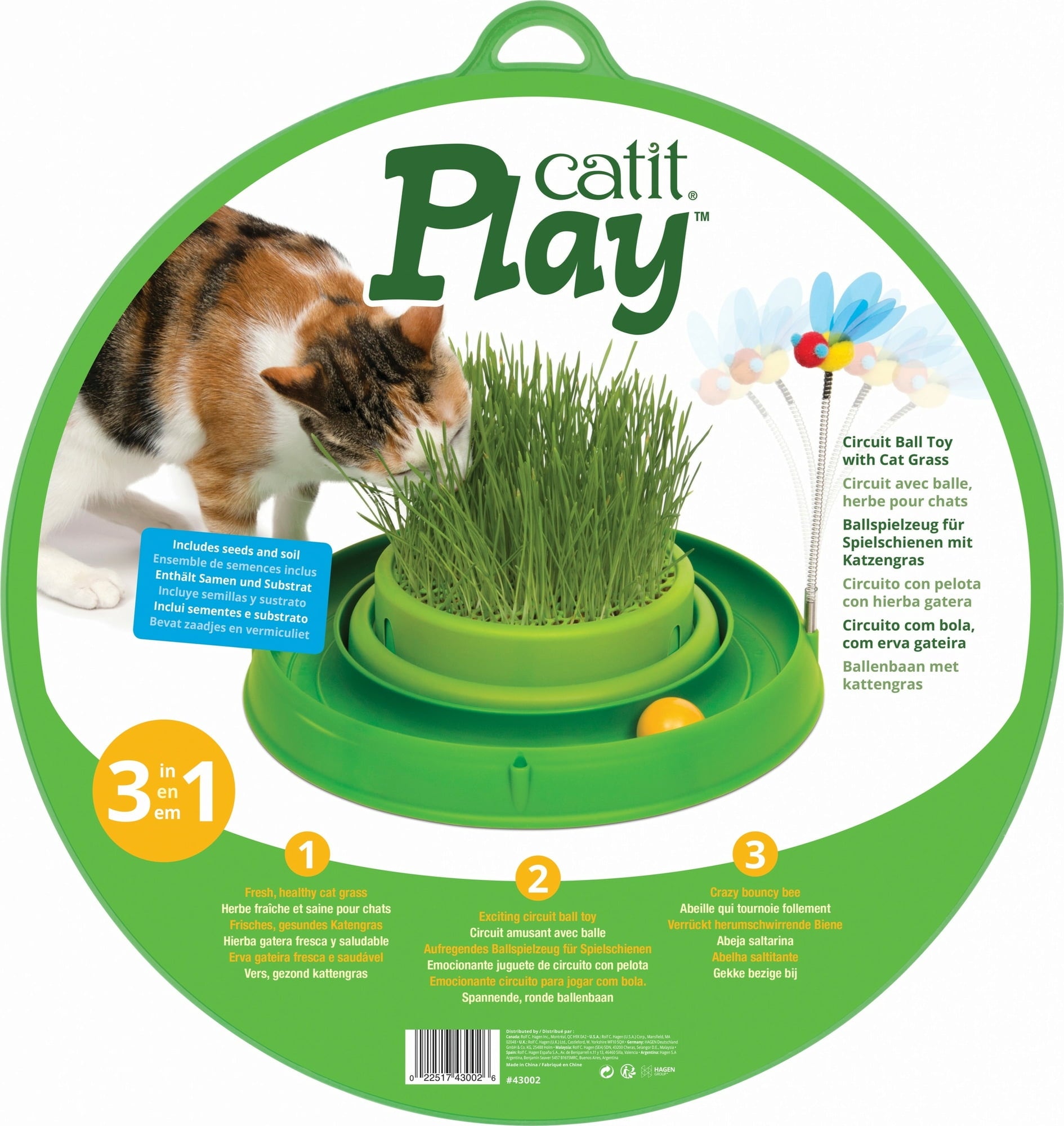 Circuit de jeu pour chats avec une balle à faire tourner, une abeille qui s'agite follement à chaque mouvement et de l'herbe à chat fraîche poussera qui pousse au milieu. Le substrat et les graines sont fournies.