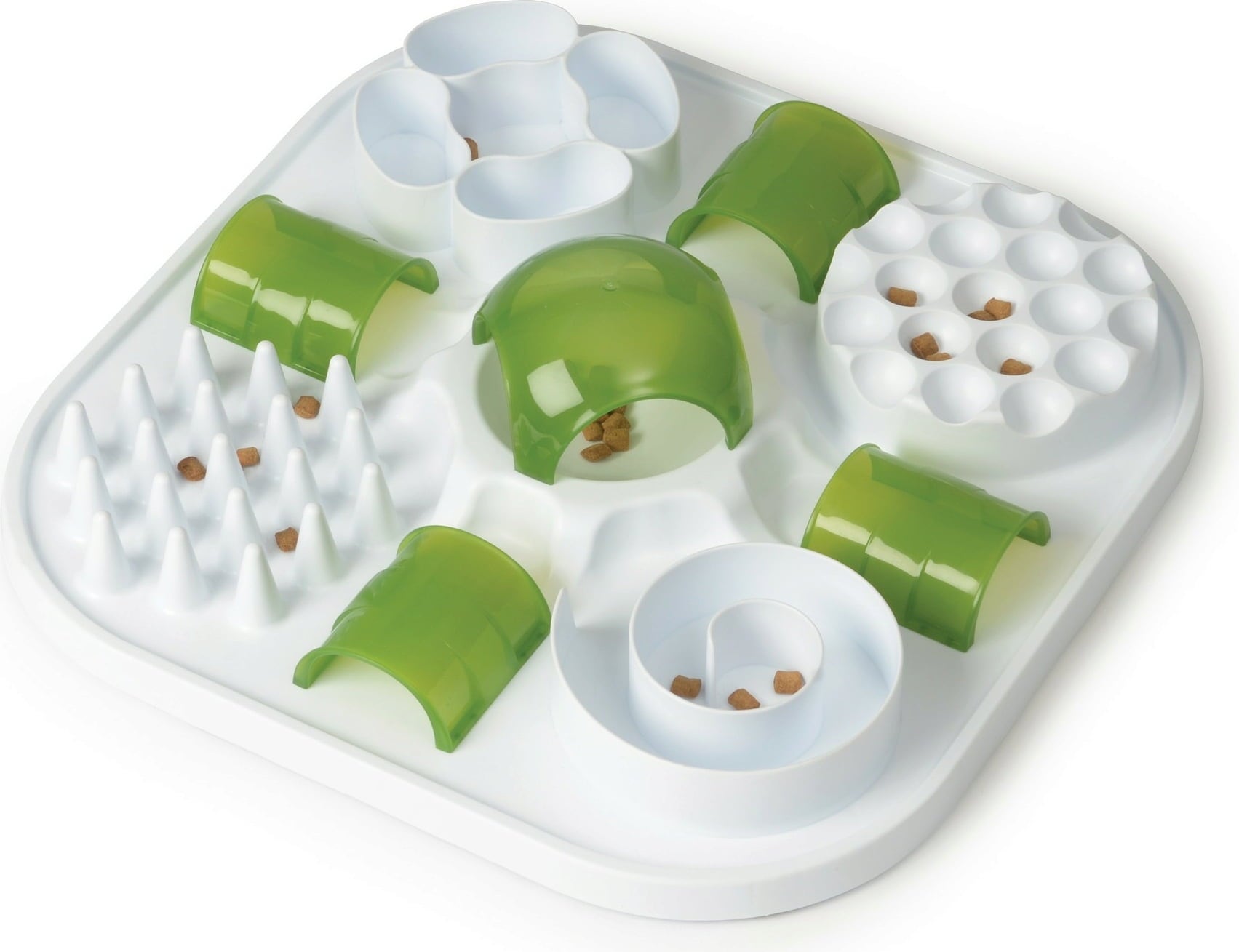 Un jeu d'adresse pour amuser votre chat et le faire manger plus lentement. Idéal pour les chats d'appartement qui doivent parfois rester seuls sans leur maître adoré ! Avec six tâches différentes, ce jouet chasse l'ennui tout en incitant votre félin à aller chercher ses croquettes ou friandises en s'amusant. Le plastique est sans BPA et se nettoie à l'eau chaude ou avec un produit vaisselle classique (bien rincer).