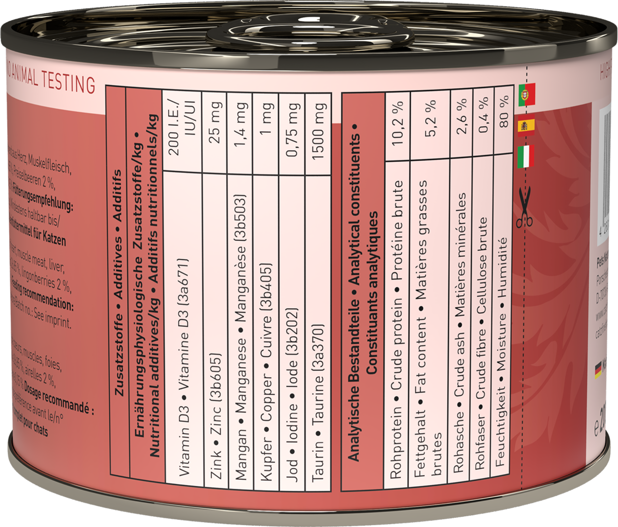 - Plus de 93% de viande, poisson, fruits de mer, abats et bouillon de cuisson, complétés par des légumes, des fruits, des herbes et des huiles précieuses, comme cela correspond au contenu de l'estomac des proies