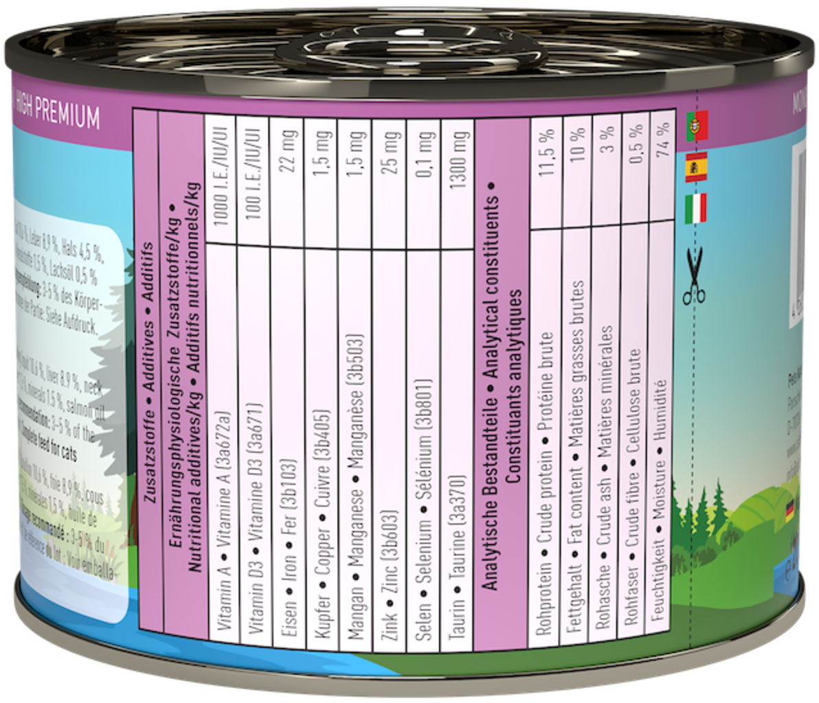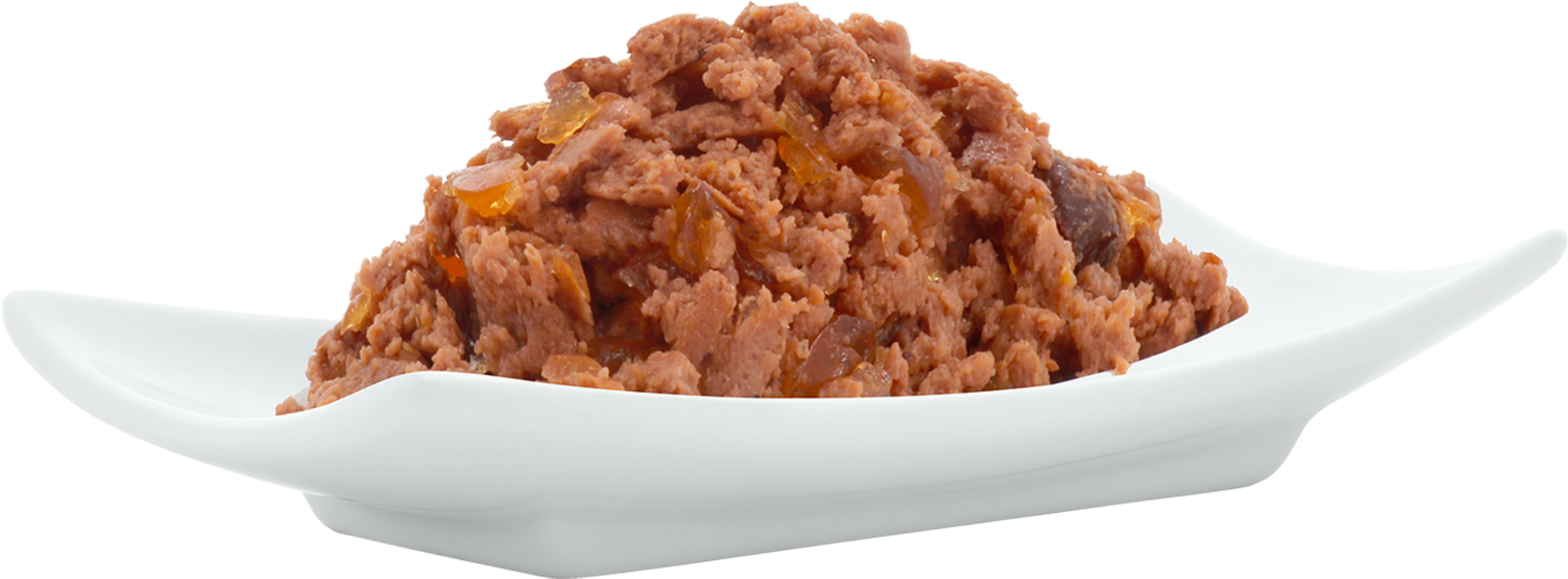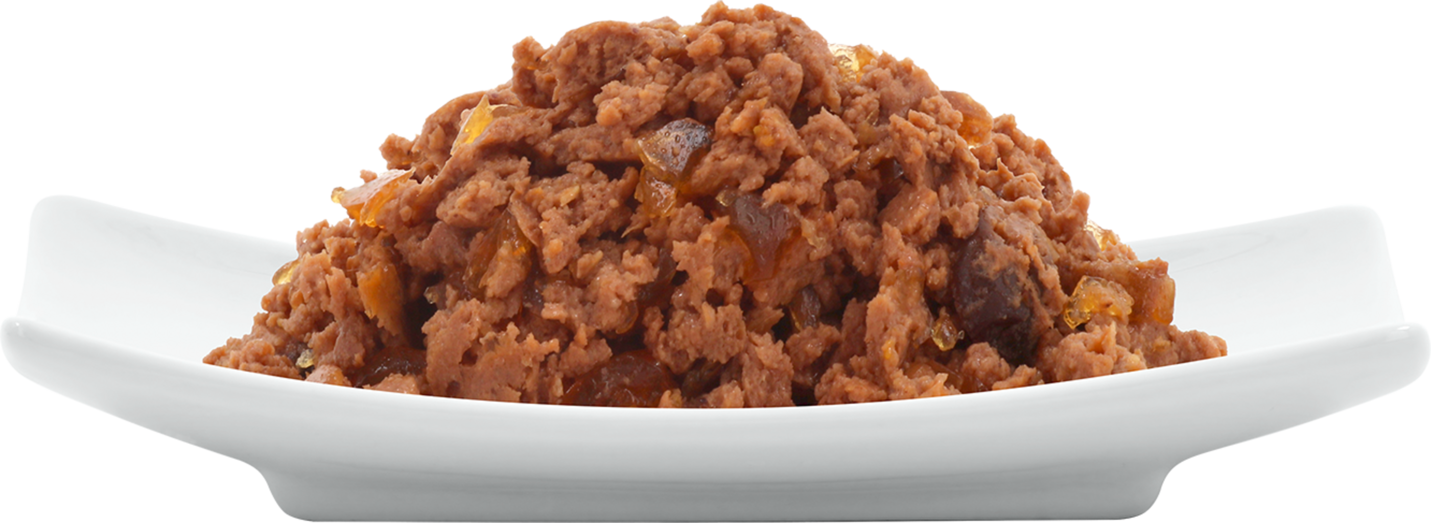 - Plus de 94 % de viande, poisson, fruits de mer, abats et jus de cuisson, complétés par une faible proportion de légumes, fruits et autres ingrédients adaptés aux chats
