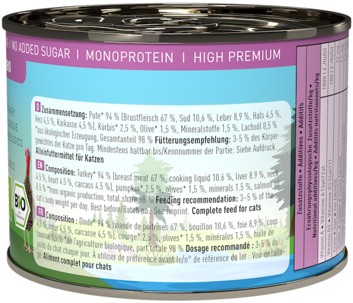 Cette pâtée monoprotéique de qualité bio offre à votre chat un plaisir naturel et parfaitement adapté à son espèce. Des ingrédients biologiques soigneusement sélectionnés et une recette inspirée du concept de proie apportent à votre chat tout ce dont il a besoin et contribuent ainsi à une vie pleine de vitalité.