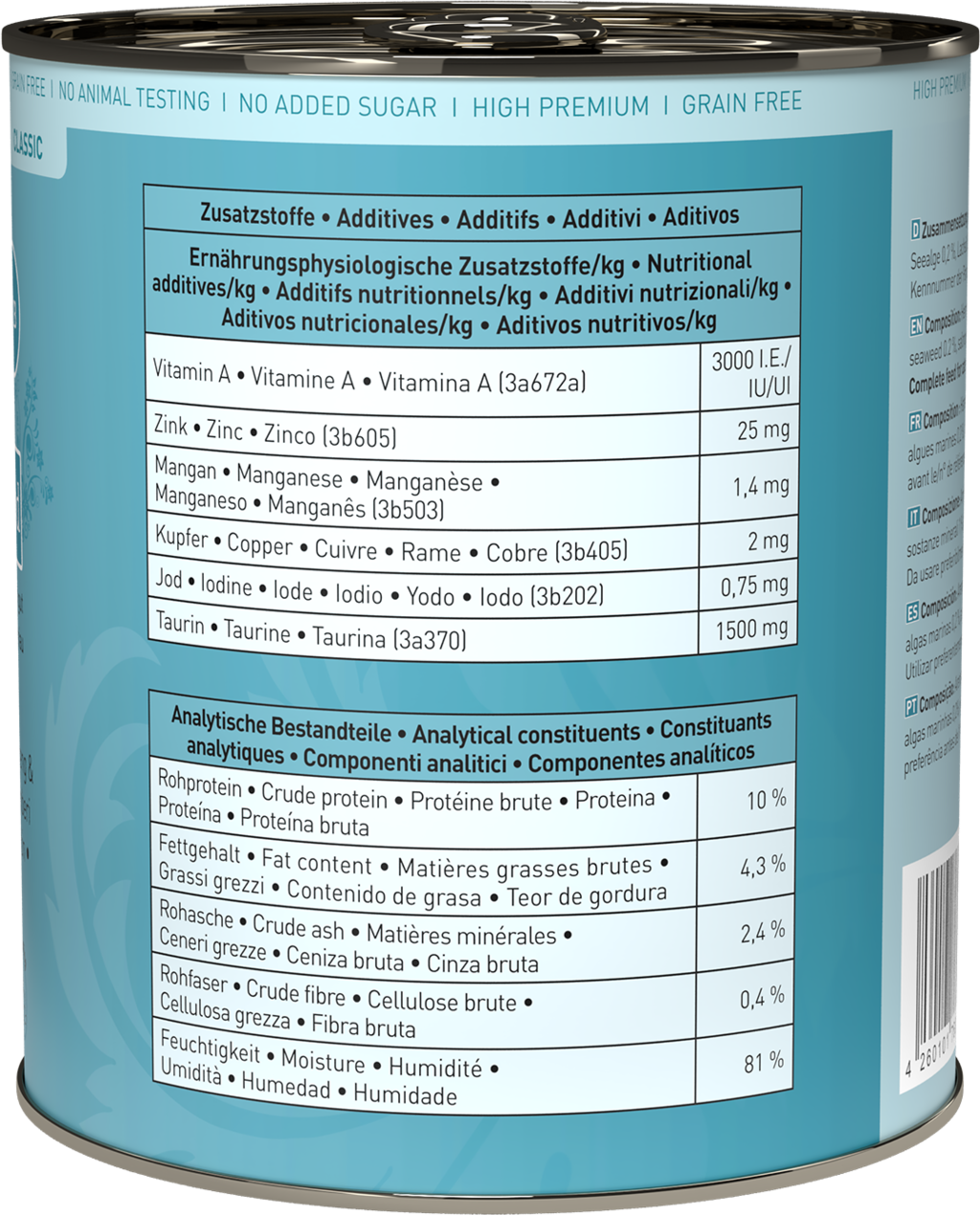 - Plus de 93% de viande, poisson, fruits de mer, abats et bouillon de cuisson, complétés par des légumes, des fruits, des herbes et des huiles précieuses, comme le contenu stomacal des proies