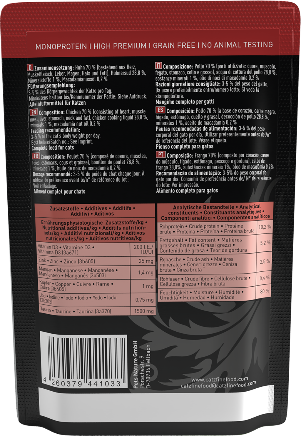 70 % poulet (cœur, muscle, foie, estomac, cou), 28,8 % Hühnersud, 1 % Mineralstoffe, 0,2 % Macadamianussöl