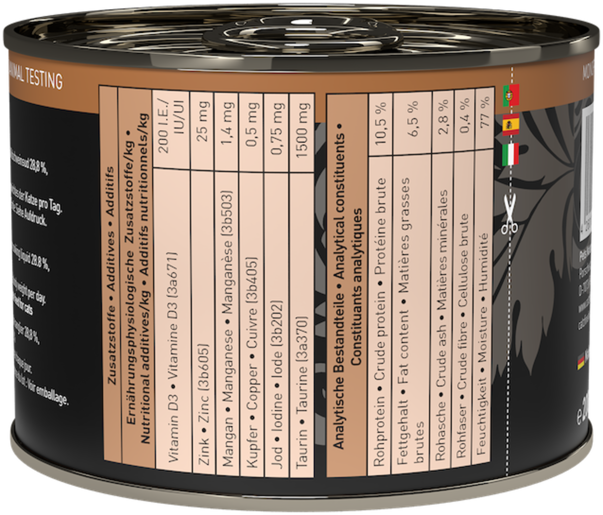 Cette délicieuse pâtée premium fera sans aucun doute ronronner votre chat ! Des ingrédients soigneusement sélectionnés, une recette adaptée à l’espèce et inspirée du concept de proie, sans aucun ingrédient superflu : un pur moment de plaisir pour votre chat d’intérieur et une excellente base pour une vie pleine de vitalité.