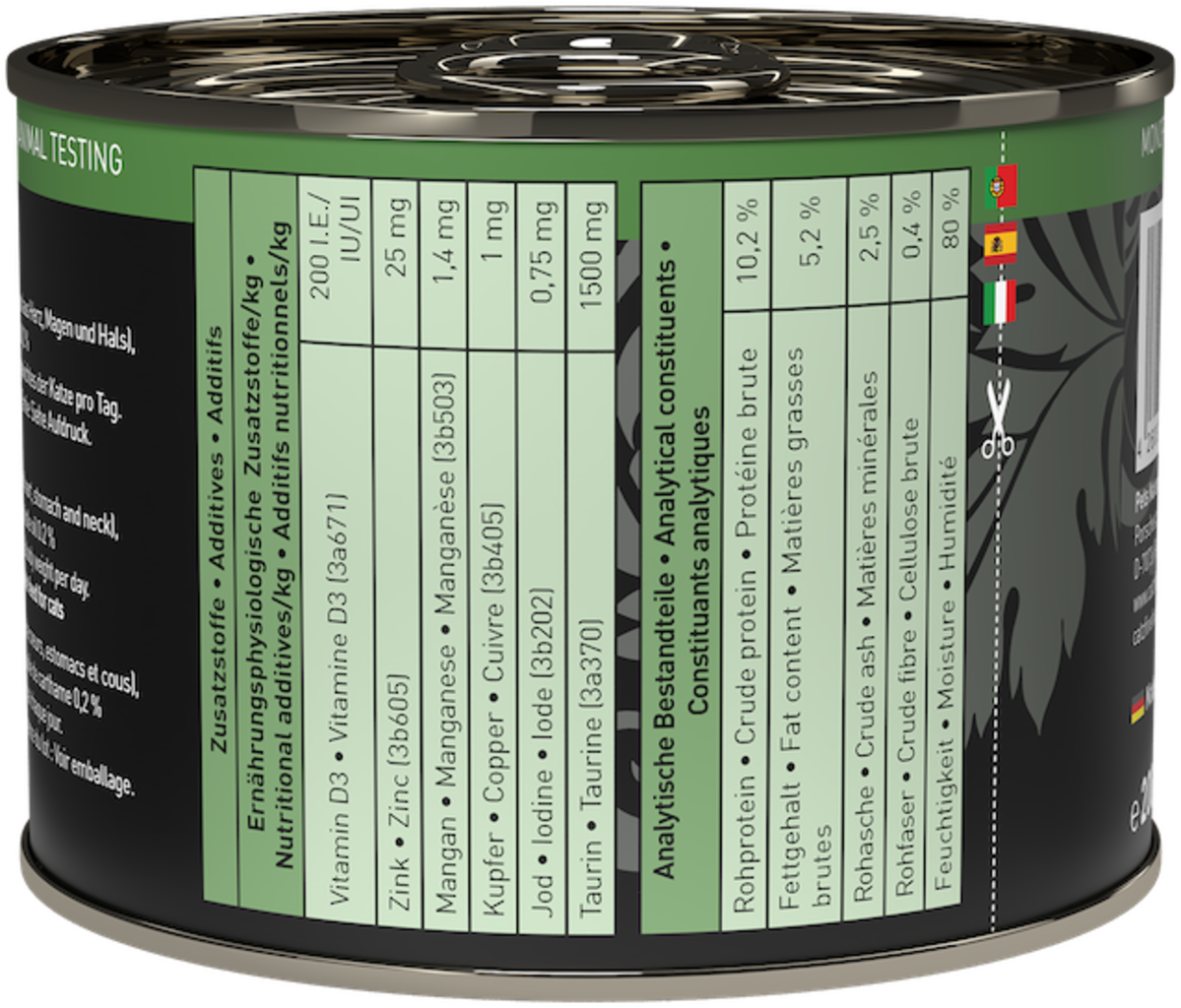 70 % canard (cœur, estomac, cou), 28,8 % Entensud, 1 % Mineralstoffe, 0,2 % huile de carthame