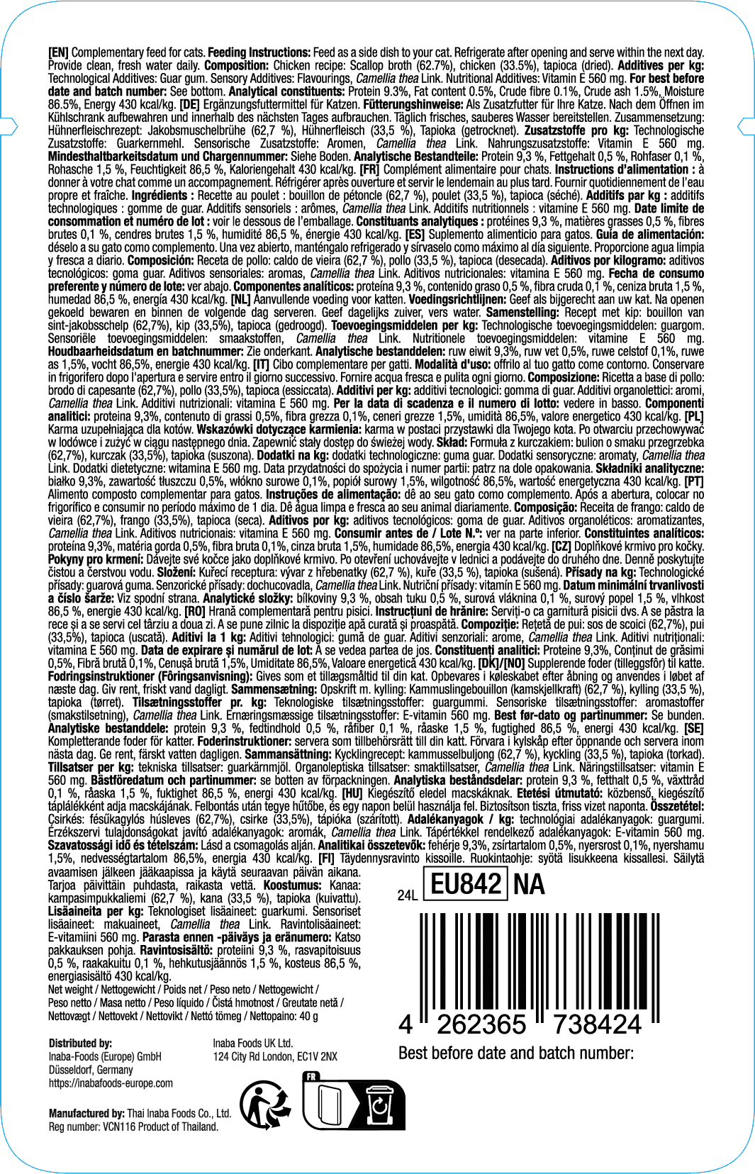 62,5 % bouillon de pétoncles, 33,5 % viande de poulet, tapioca séché, gomme de guar, gélose