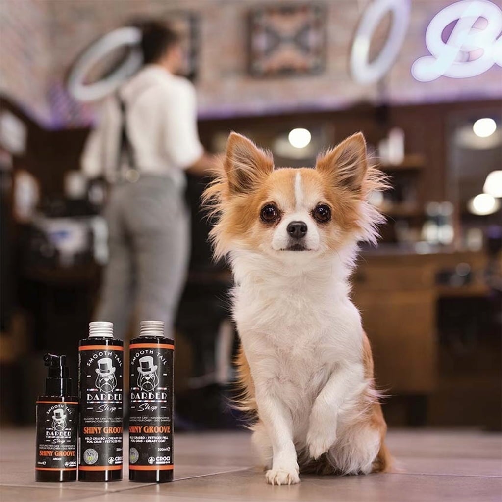 "Shiny Groove" fait partie de la ligne de soins Smooth Tail au parfum discret d'argan. Les produits ont un effet neutralisant sur les odeurs. Tous les produits Barbershop pour le toilettage des chiens contiennent des ingrédients naturels, sans parabènes ni colorants artificiels. Tous les tensioactifs sont à base d'origine végétale.