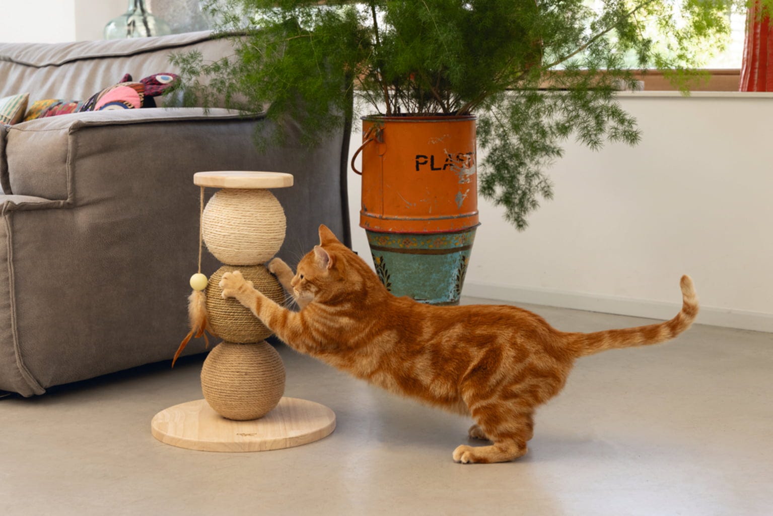 Ce tour griffoir et de jeu attire tous les regards et constitue non seulement une activité idéale pour votre chat, mais aussi un élément décoratif élégant pour votre intérieur. Les trois balles superposées sont chacune enveloppées d’un matériau différent, offrant ainsi une grande variété de textures. La balle à plume intégrée apporte une touche supplémentaire de divertissement et invite à la poursuite.