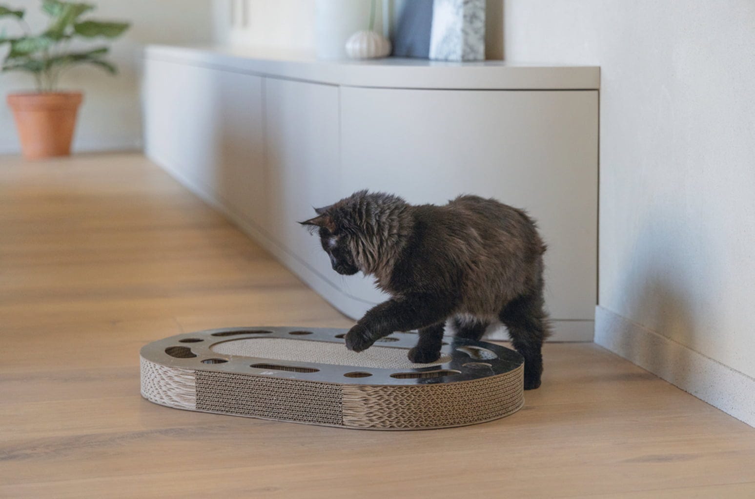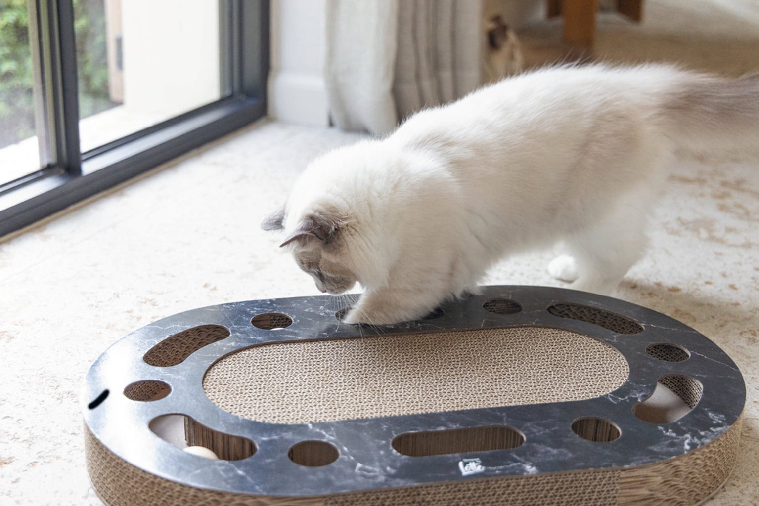 Ce jouet polyvalent pour chats chasse l’ennui en un instant. Il offre une large surface horizontale pour faire ses griffes et, grâce aux deux balles qui roulent à l’intérieur, assure divertissement et stimulation. L’herbe à chat dissimulée dans la structure rend le jeu encore plus irrésistible et attractif.
