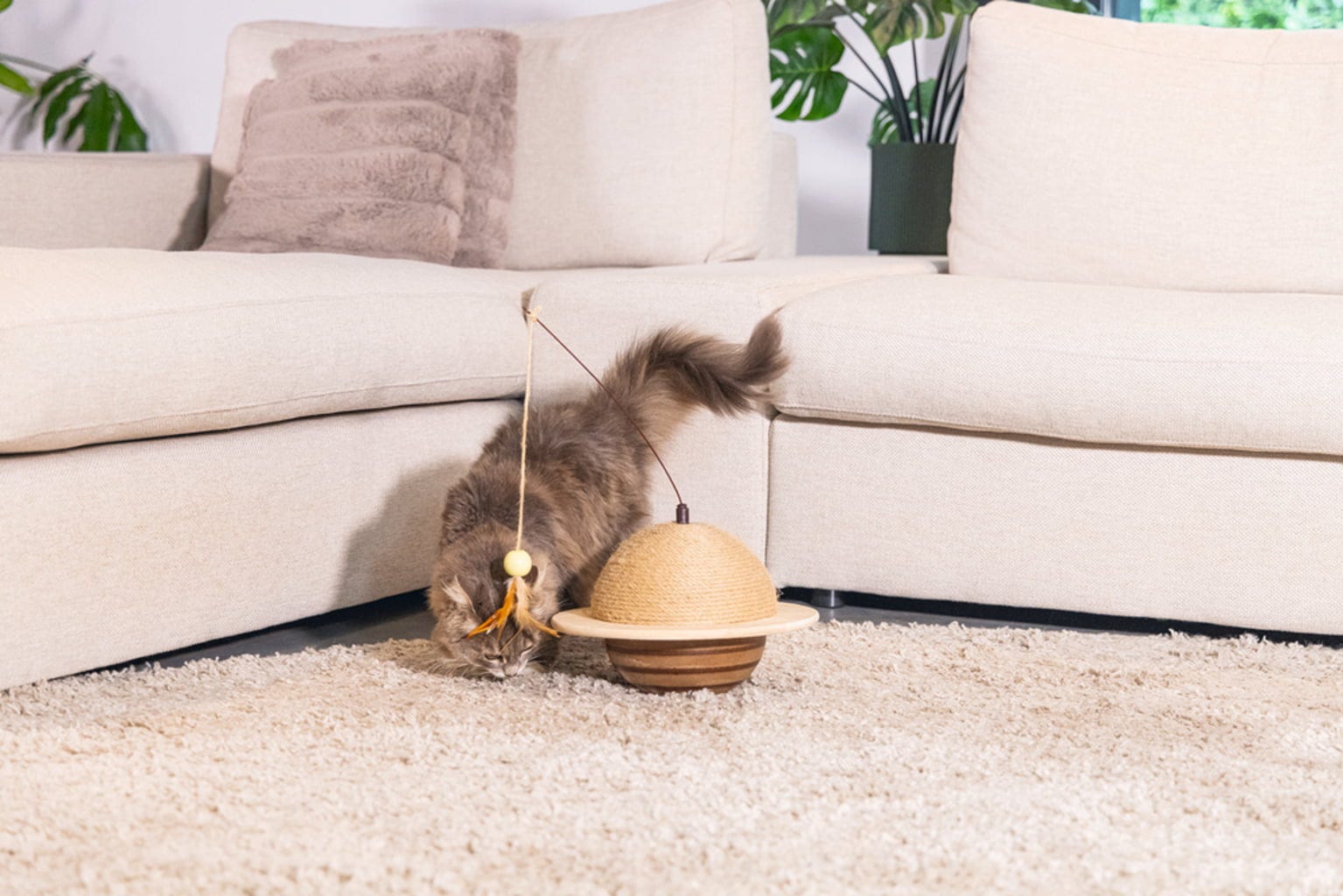 Cette balle griffoir est particulièrement ludique grâce à sa mobilité et stimule votre chat à chaque utilisation. La canne à pêche intégrée pour chat offre un divertissement supplémentaire.