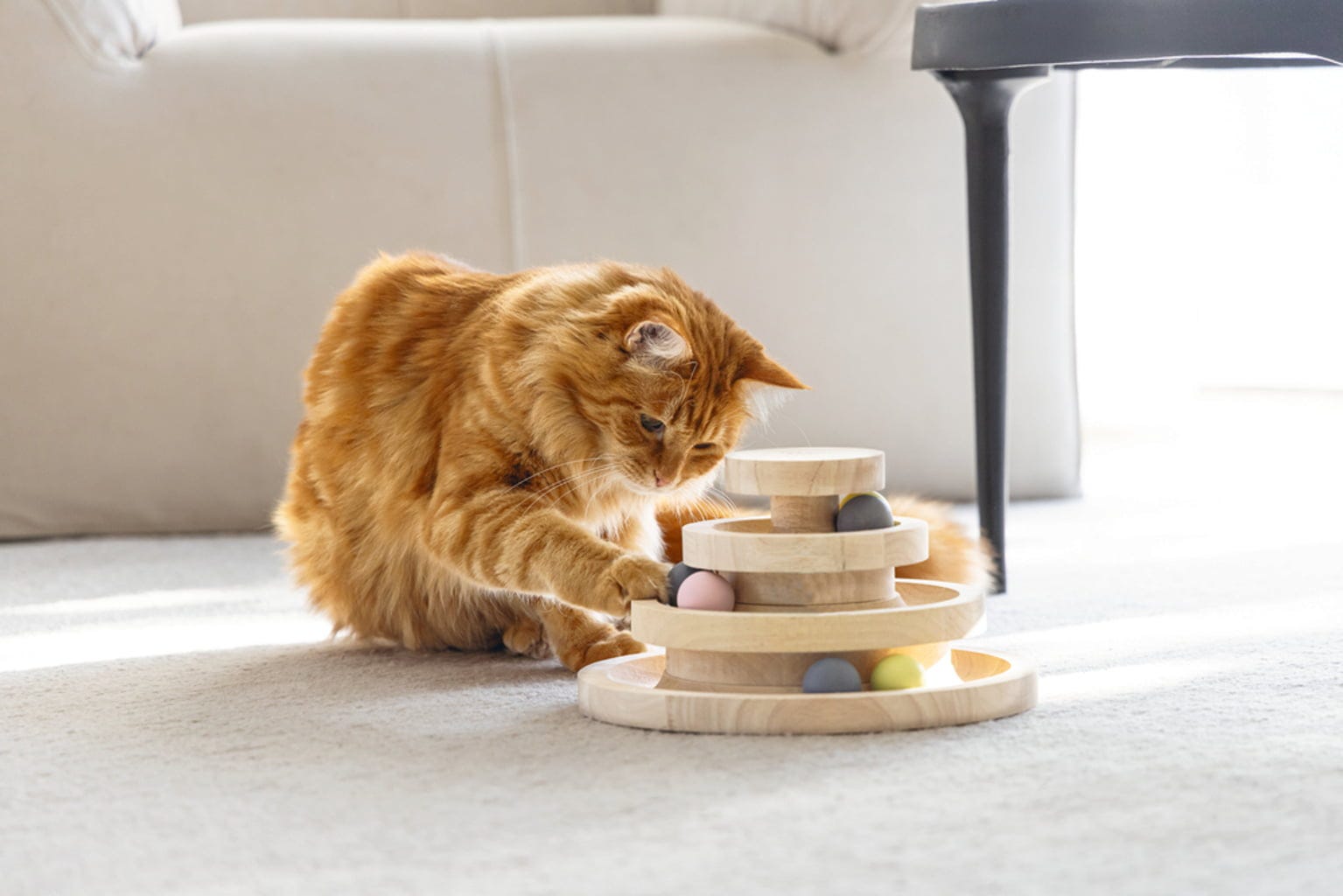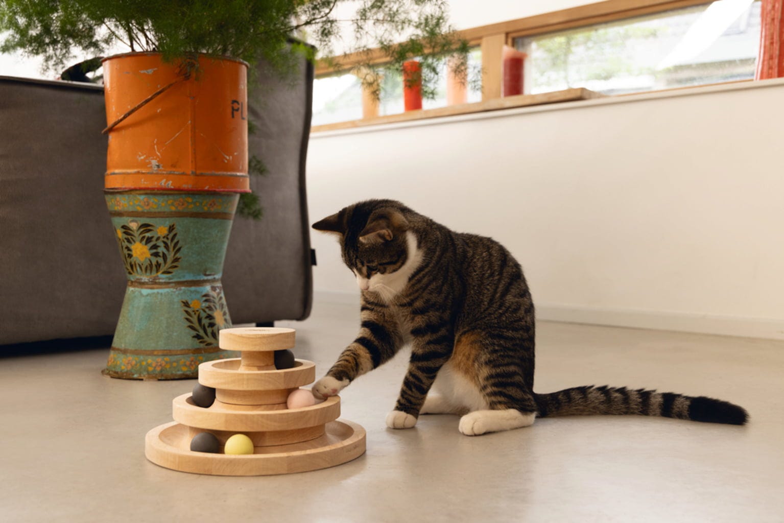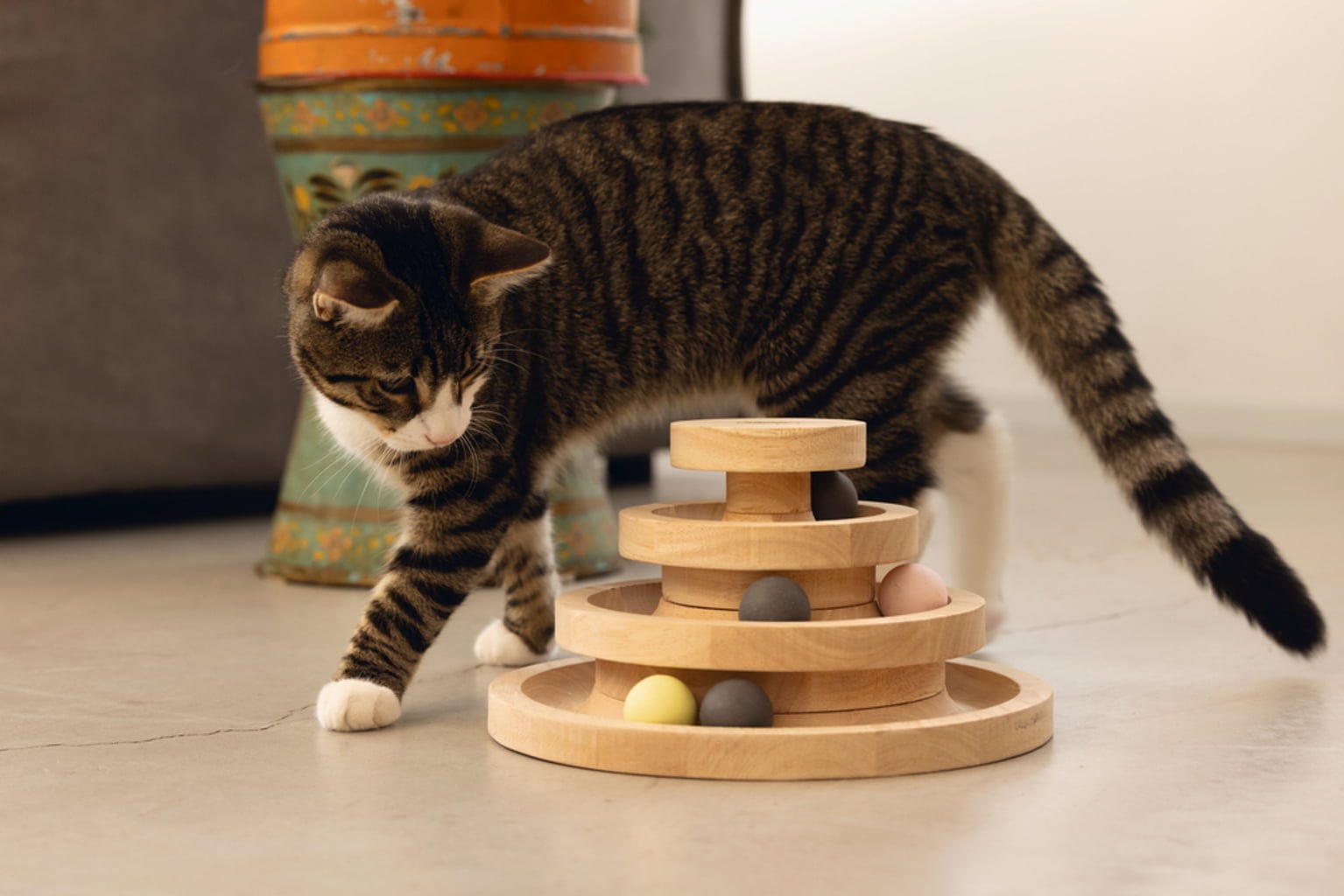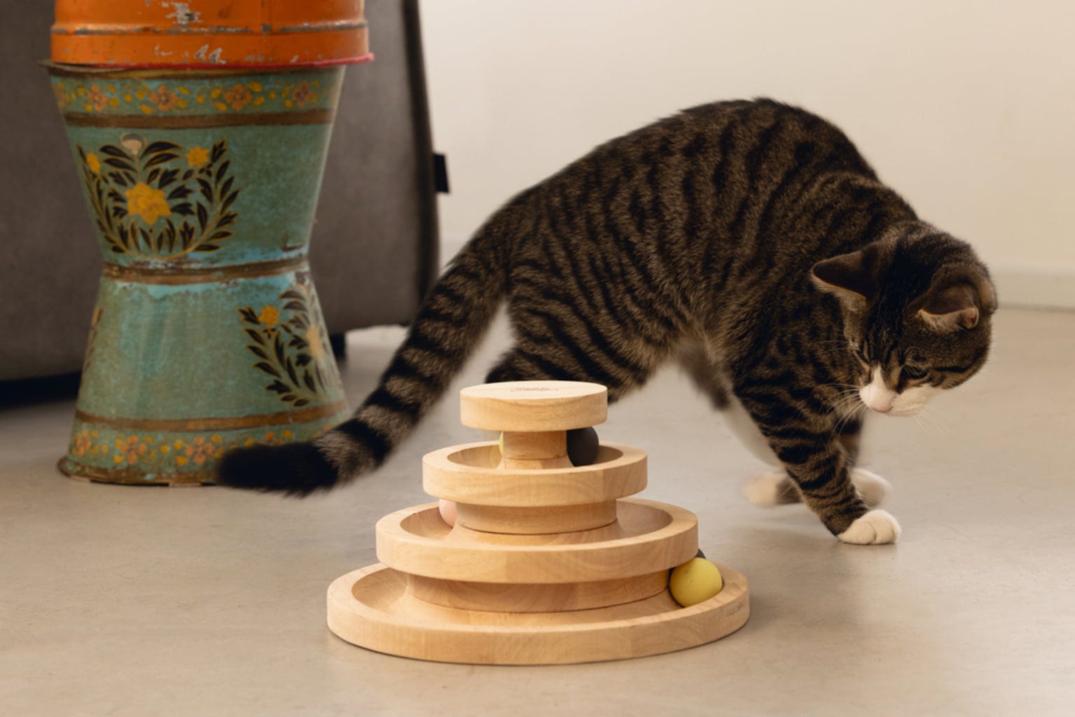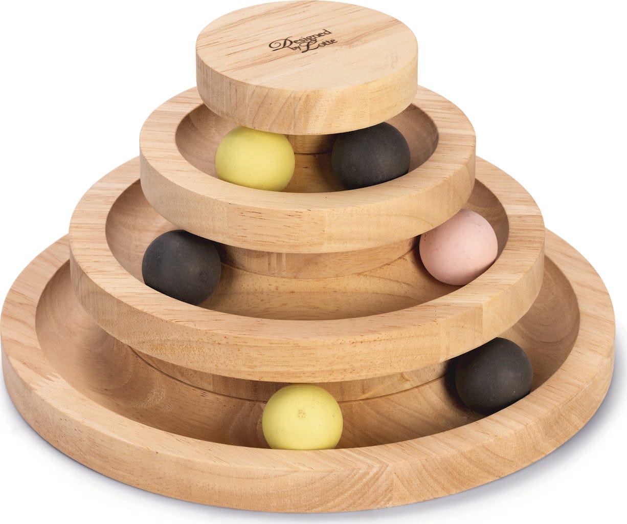Cette tour est un véritable plaisir ! Réparties sur trois niveaux, six balles en bois stimulent l’instinct de jeu et de chasse, tout en chassant l’ennui en un instant.