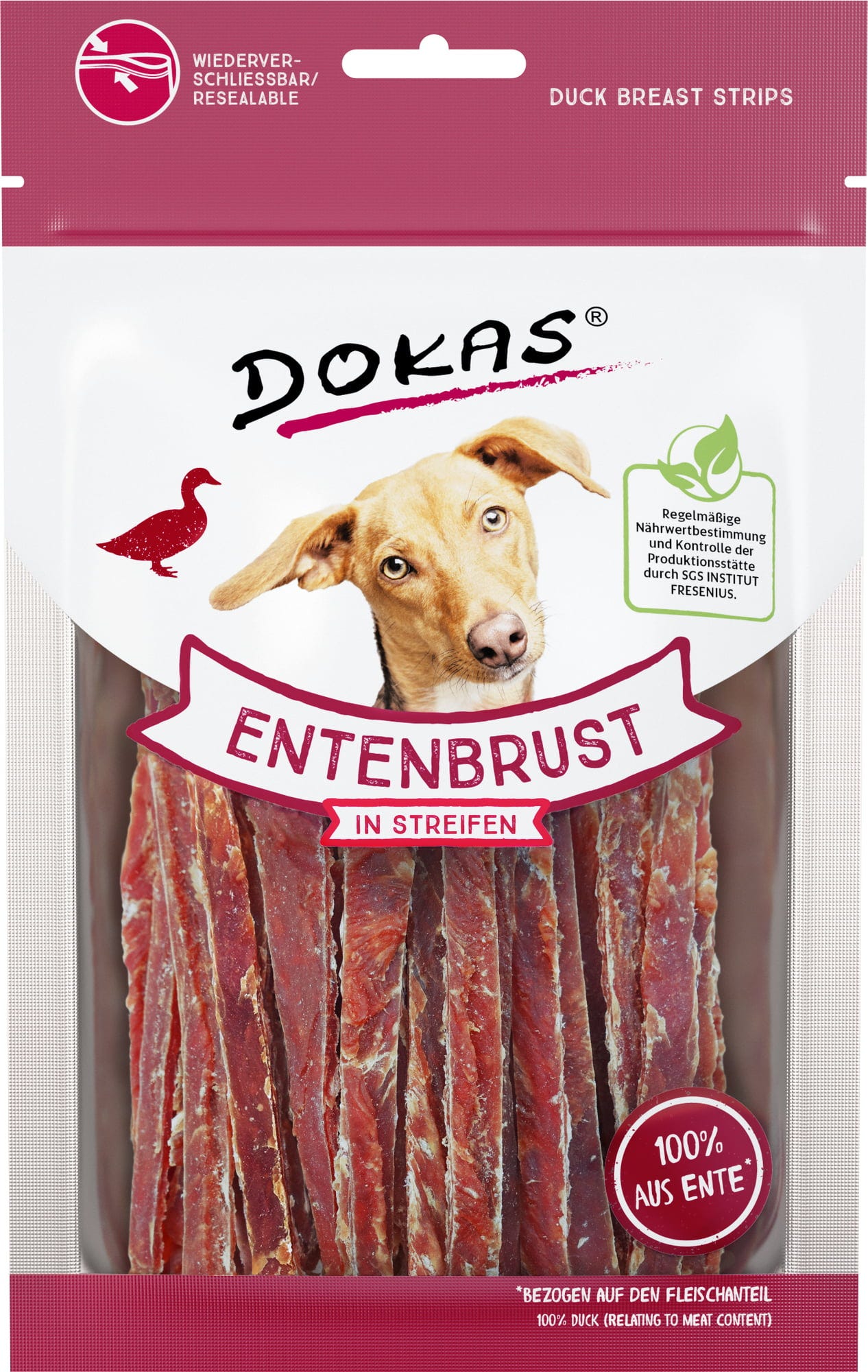 Ces fines lamelles de viande de Dokas sont délicatement séchées à l’air et particulièrement pauvres en matières grasses. Elles sont fabriquées à 100 % à partir de viande de filet de poitrine de canard de haute qualité* et constituent une délicieuse collation entre les repas.