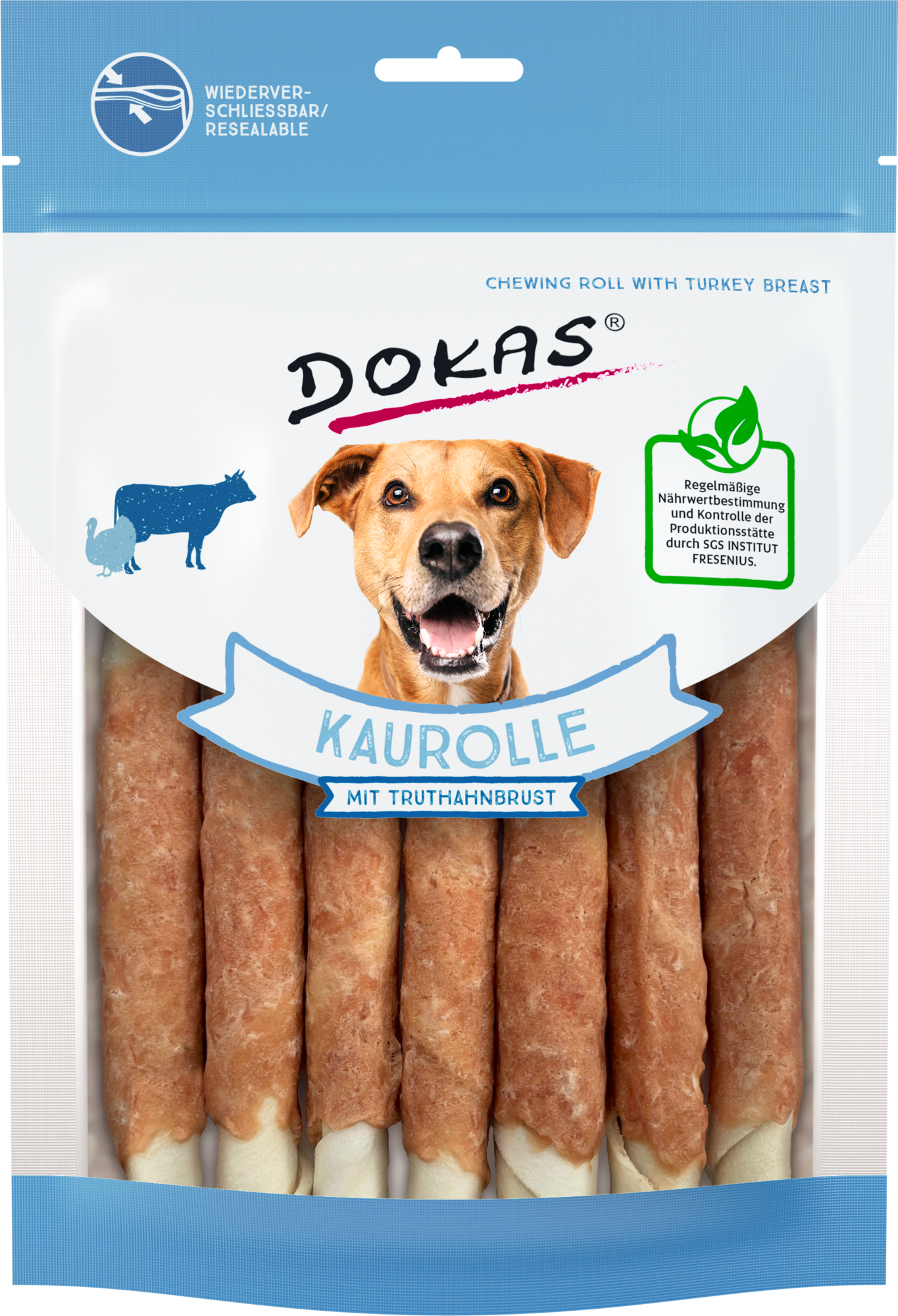 Les rouleaux à mâcher de Dokas sont composés de peau de bœuf savoureuse, enrobée de fine viande de dinde, et séduisent pleinement par leur goût. La mastication intensive renforce également la musculature et peut contribuer à l’hygiène dentaire quotidienne.