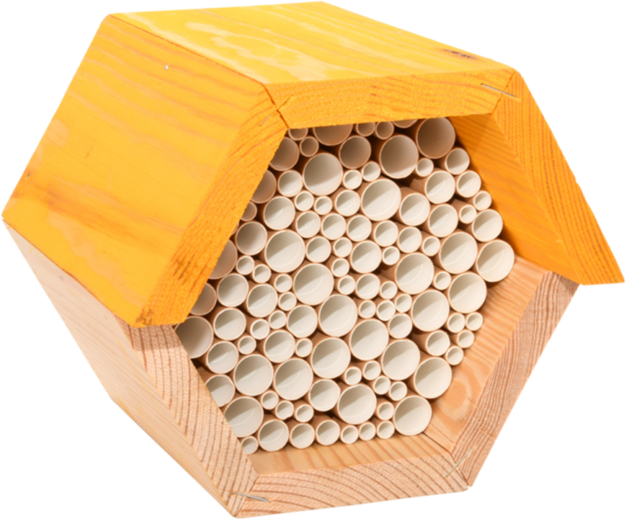 Cette maison à abeilles hexagonale constitue un précieux refuge pour les abeilles sauvages au jardin. Les tubes en carton offrent des conditions de nidification idéales : chaque alvéole est soigneusement garnie par les abeilles d’un œuf, de pollen et de nectar. Placée dans un endroit ensoleillé orienté au sud, elle contribue activement à la préservation de la biodiversité.