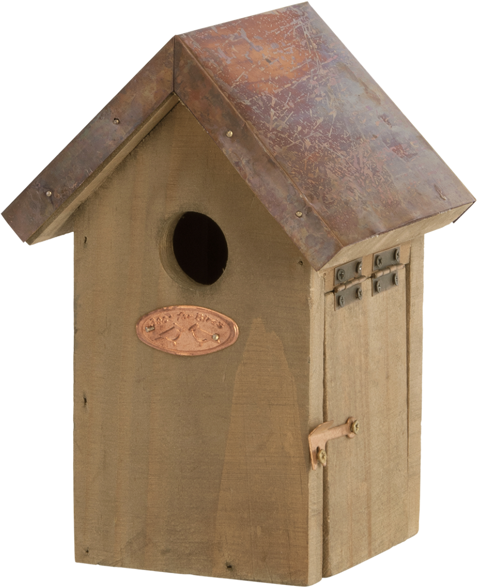 Ce nichoir est parfait pour fournir aux troglodytes, un refuge en hiver et un endroit pour élever leurs petits. La maison est en bois de pin et a un toit en cuivre.