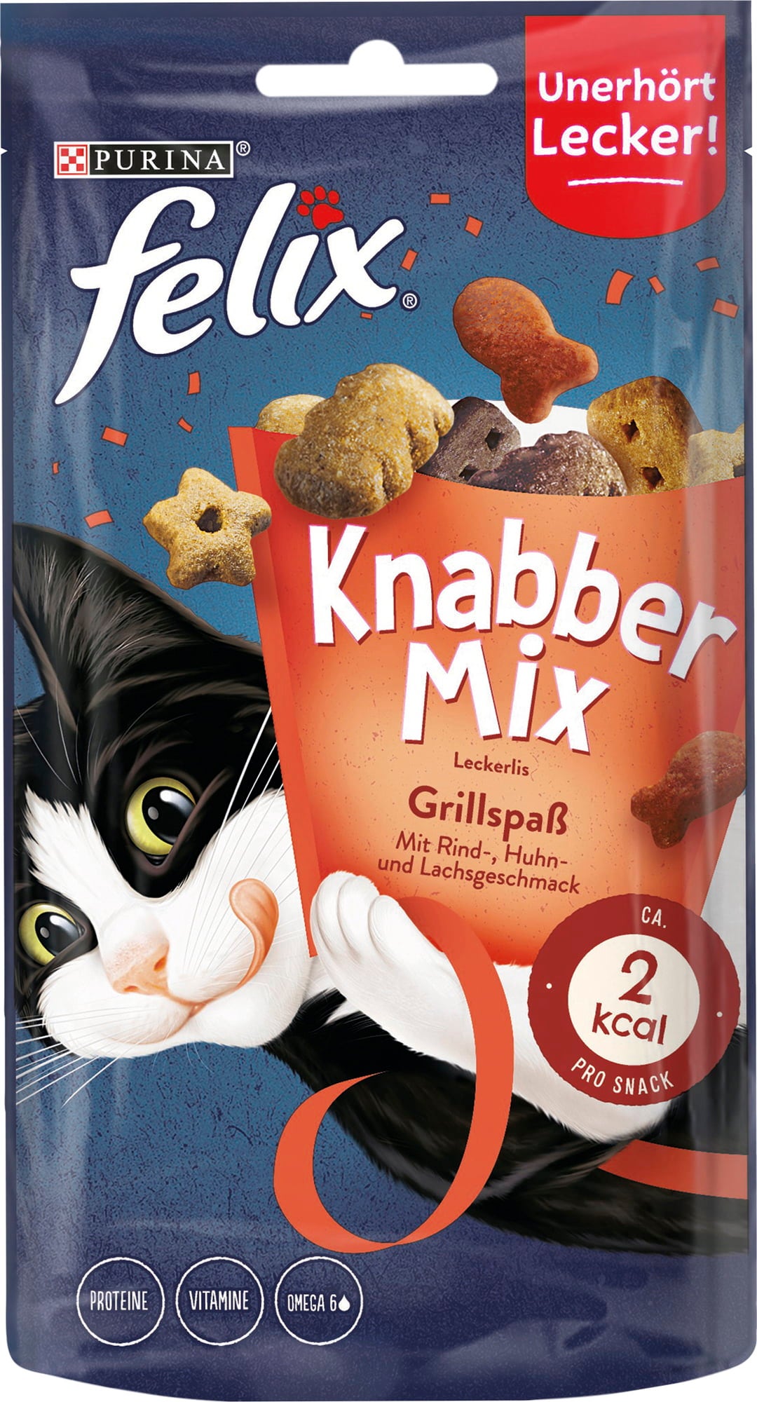 Party Mix de Felix réunit des snacks aux formes et aux saveurs variées qui sauront ravir votre chat. Le mix Mixed Grill se compose de friandises au goût de poulet, de bœuf et de saumon, et chaque pièce apporte en moyenne 2 kcal. Une collation ludique et gourmande pour votre petit félin !