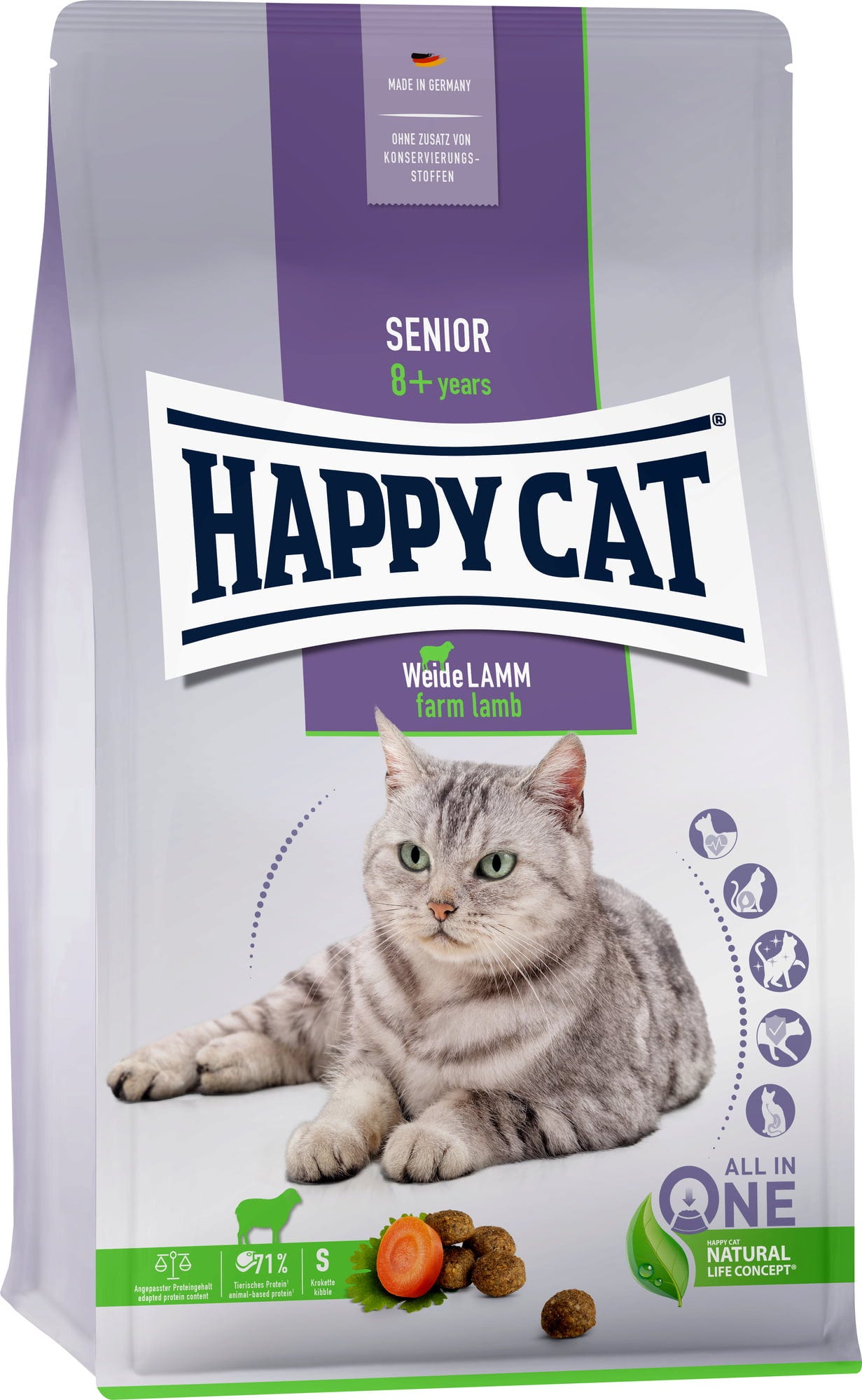 Les chats âgés ont besoin d'une alimentation spécifique adaptée à leurs besoins changeants. Les délicieuses Croquettes Senior de Happy Cat régalent votre chat âgé avec de l'agneau de pâturage facile à digérer, de la coriandre aromatique et des carottes croquantes. Ces croquettes savoureuses ont une teneur adaptée en protéines, sodium et phosphore pour soutenir le métabolisme des chats âgés. Avec des moules vertes de Nouvelle-Zélande.