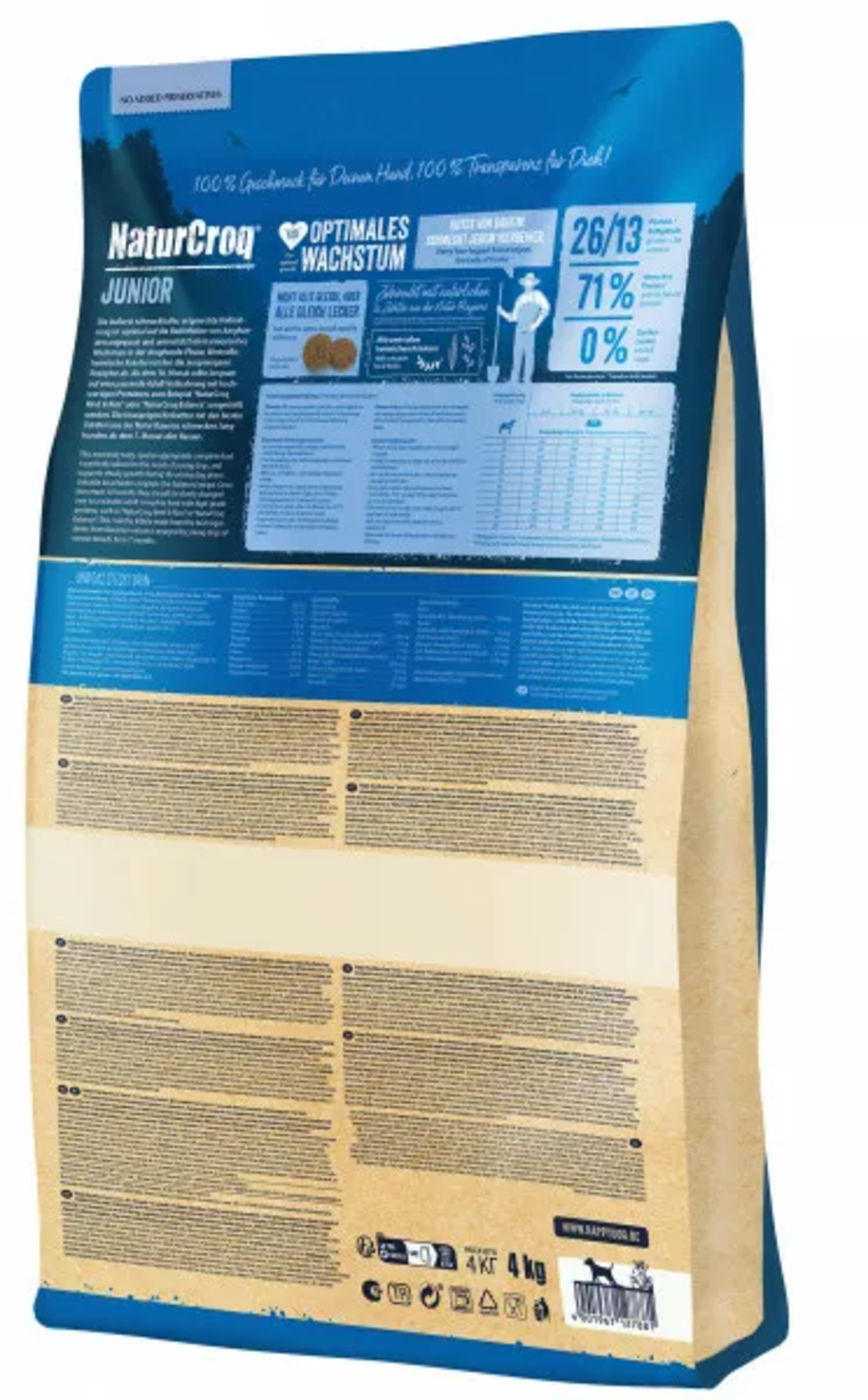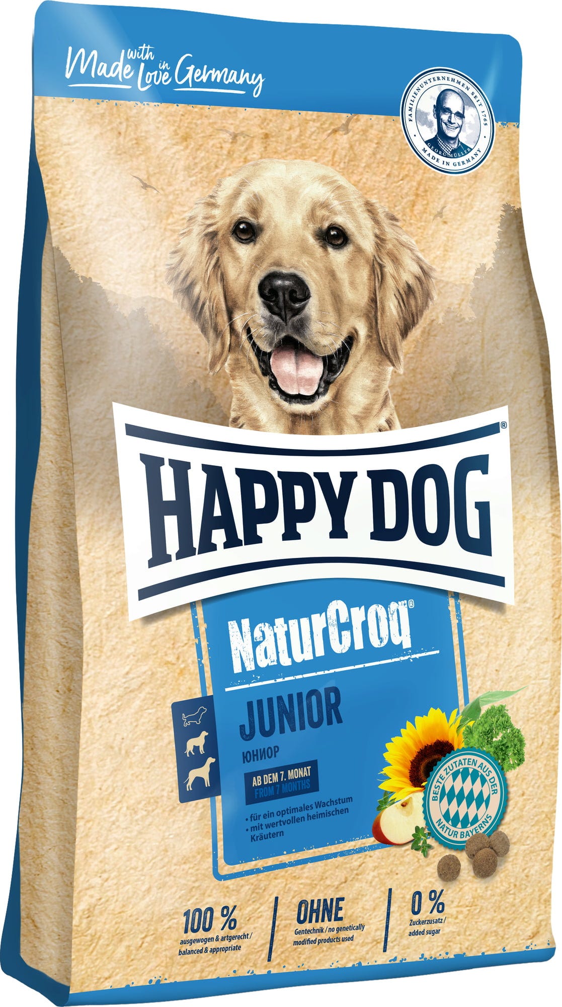 À partir du 7ᵉ mois, la croissance du chien ralentit par rapport à la phase de chiot. Afin d’accompagner ce changement, les besoins en protéines et en énergie doivent être adaptés par l’alimentation. Happy Dog NaturCroq Junior contient de précieuses protéines issues de la viande et des céréales complètes, avec des ingrédients naturels provenant de la région bavaroise. La recette est enrichie d’herbes locales savoureuses et se montre particulièrement douce pour l’estomac et l’intestin. Avec des acides gras oméga-3 et oméga-6.