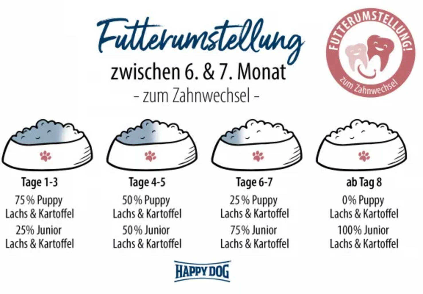 Conseil : il est recommandé de donner une nourriture pour jeunes animaux jusqu’à l’âge de 6 mois. À partir du 7ᵉ mois, il est possible de passer à une nourriture junior.