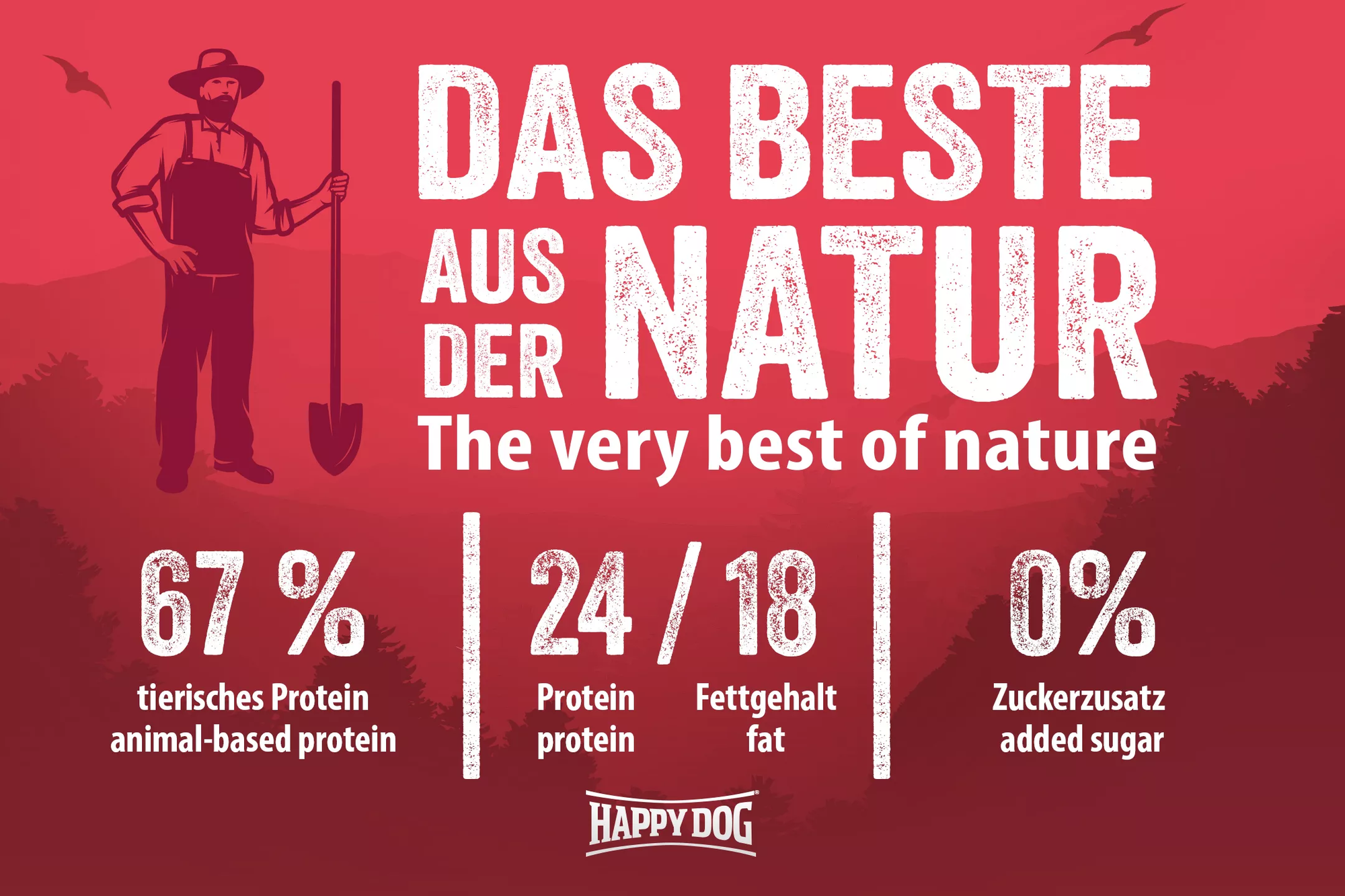 Avec NaturCroq Active, Happy Dog a développé une combinaison équilibrée de nutriments spécialement adaptée aux chiens adultes actifs. Le mélange de volaille et de poisson fournit des protéines de haute qualité, tandis que l’huile de tournesol et l’huile de colza apportent de précieux acides gras oméga 3 et 6 à la recette. Les céréales complètes sélectionnées servent de source de fibres et fournissent également des glucides complexes. Elles contiennent en outre des vitamines du groupe B et des minéraux. La recette est complétée par des herbes sélectionnées. Ces croquettes présentent une composition à base d’ingrédients naturels de Bavière et contiennent pas moins de 69 % de protéines animales, sans sucres ajoutés.