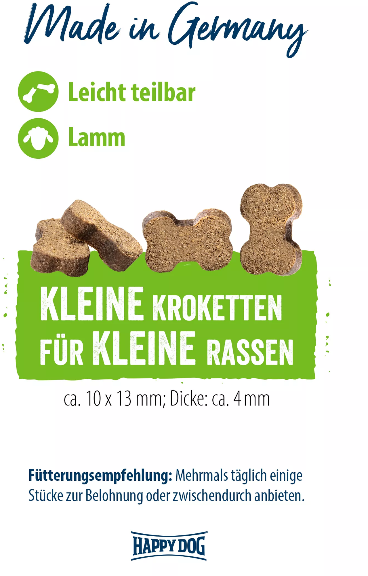 Les croquettes (10 x 13 mm) se divisent facilement en deux, ce qui les rend idéales pour des séances d’entraînement plus longues. Sans sucre, sans colorants artificiels ni conservateurs, et fabriquées en Allemagne.