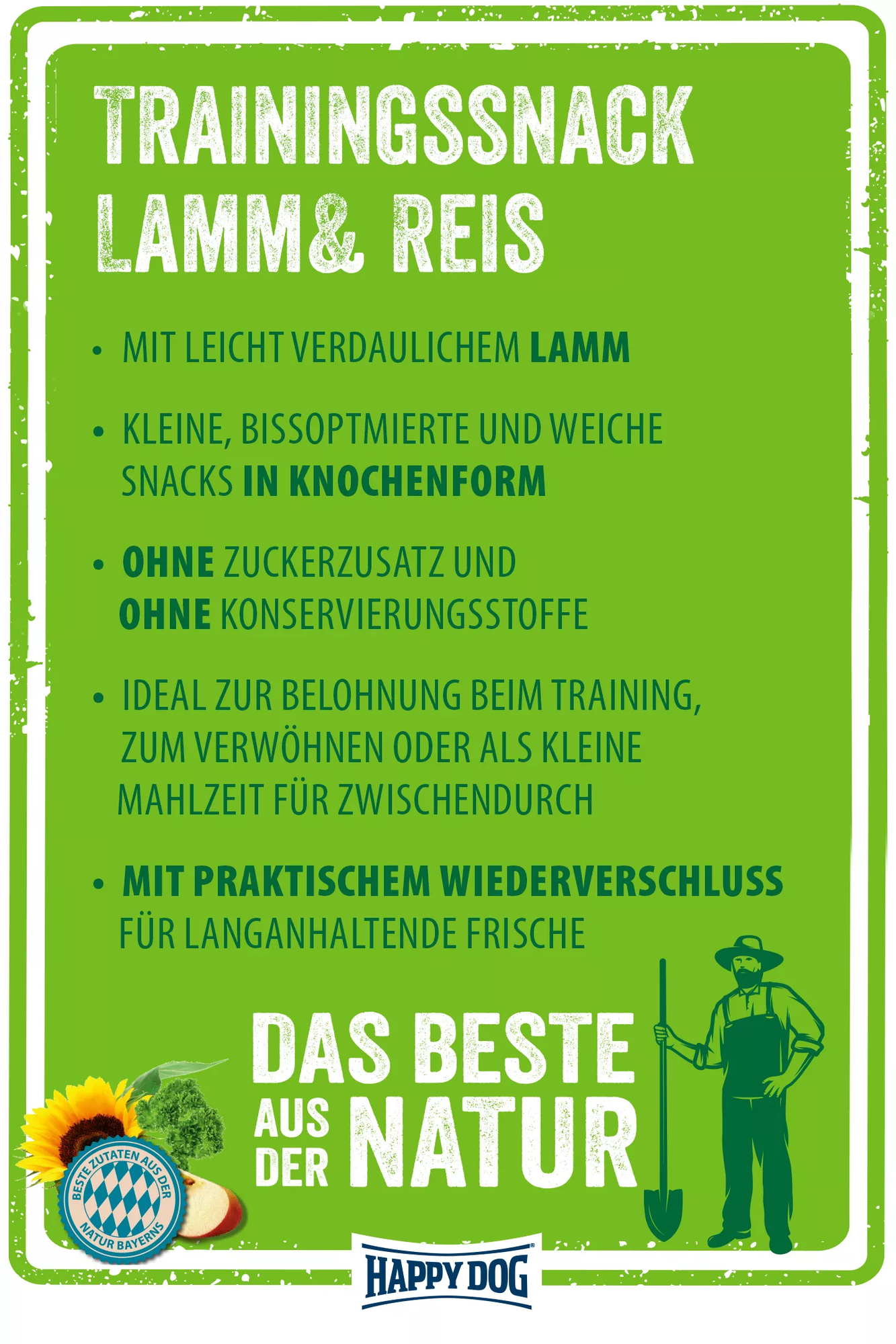Ces délicieux mini snacks d’entraînement ont été spécialement développés pour les chiens adultes de petite taille. Préparés exclusivement à partir d’ingrédients naturels issus de la région bavaroise, ils associent savoureusement l’agneau au riz.