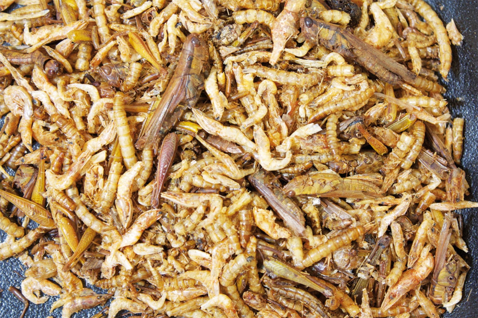 34 % sauterelles séchées, 33 % vers de farine déshydratés, 33 % crevettes déshydratées