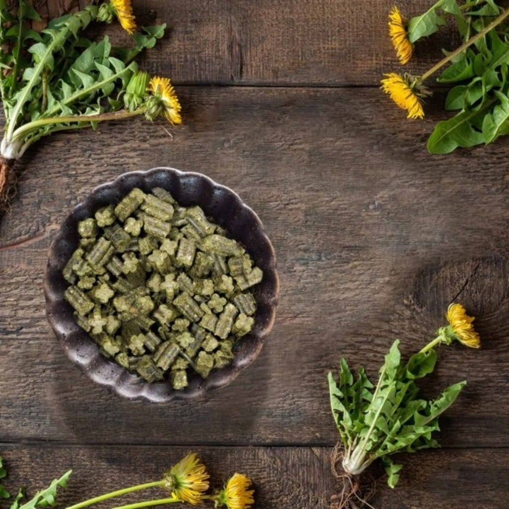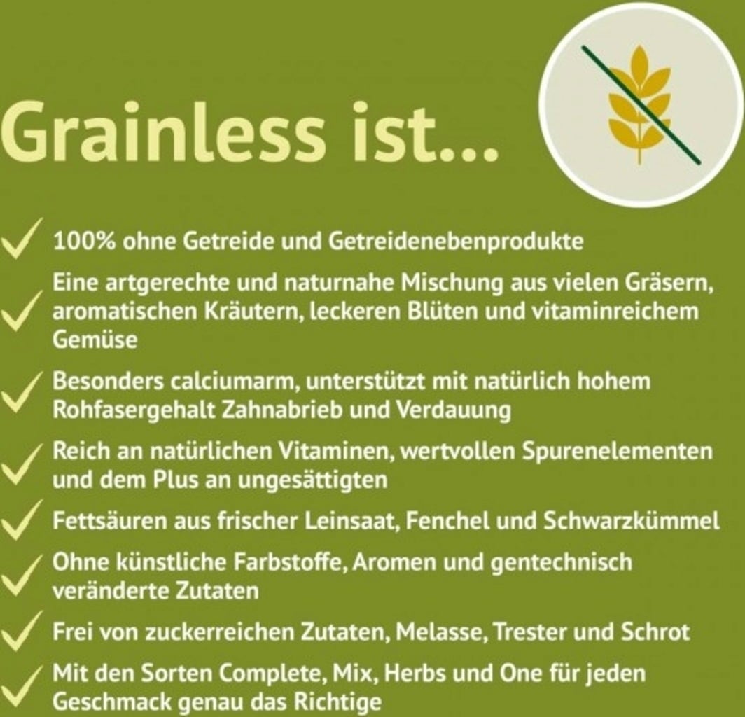 repousse de prairie permanente des Préalpes (composé entre autres de fléole noueuse, amarante, fromental, dactyle aggloméré, avoine pubescente, pâturin des prés, trèfle des prés, renoncule âcre, flouve odorant, houlque laineuse, avoine jaunâtre, vesce à feuilles étroites, luzerne lupuline, Löwenzahn, plantain lancéolé, primevère officinale, grande marguerite, pâquerette, grande pimprenelle, caille-lait blanc, panais, Oseille, véronique petit-chêne, céraiste commun, ray-grass allemand, brome mou, vesce craque, vesce sauvage, orchis dentelé, renoncule bulbeuse, rhinanthe mineur, cerfeuil sauvage, achillée millefeuille), Flocons de pois, flocons de fèves, carotte séchée, panais, graines de lin, Nigelle, menthe poivrée, ortie, mélisse, betterave rouge, persil, pomme , graines de fenouil, 0,3 % Löwenzahn, fleur de camomille