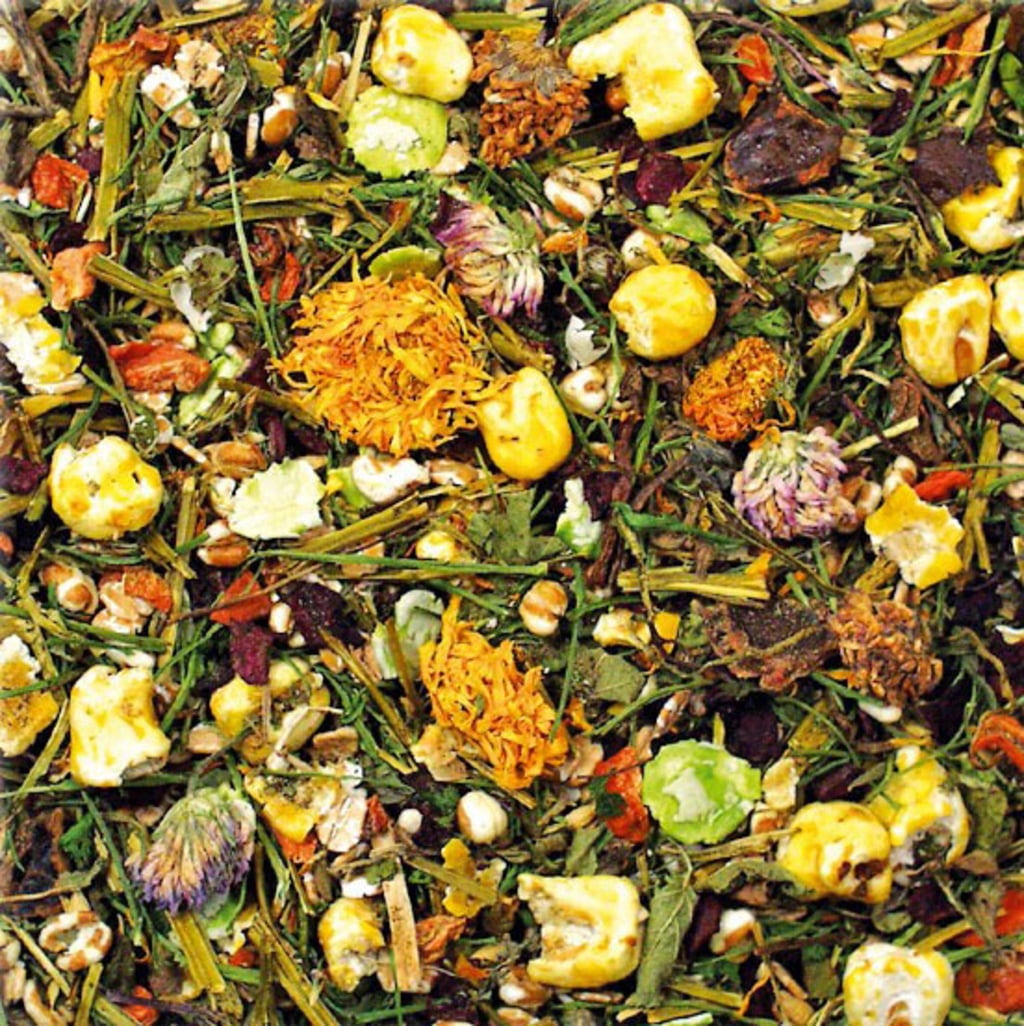 Flocons d'avoine , flocons de blé, Flocons de pois, carotte séchée, persil, luzerne, Blé, blé soufflé, flocons de maïs, maïs soufflé, mélisse, 3,3 % menthe poivrée, betterave rouge, plantain lancéolé, échinacée, 1 % Fleurs de calendula, trèfle des prés, avoine, Löwenzahn, foin de prairie de montagne