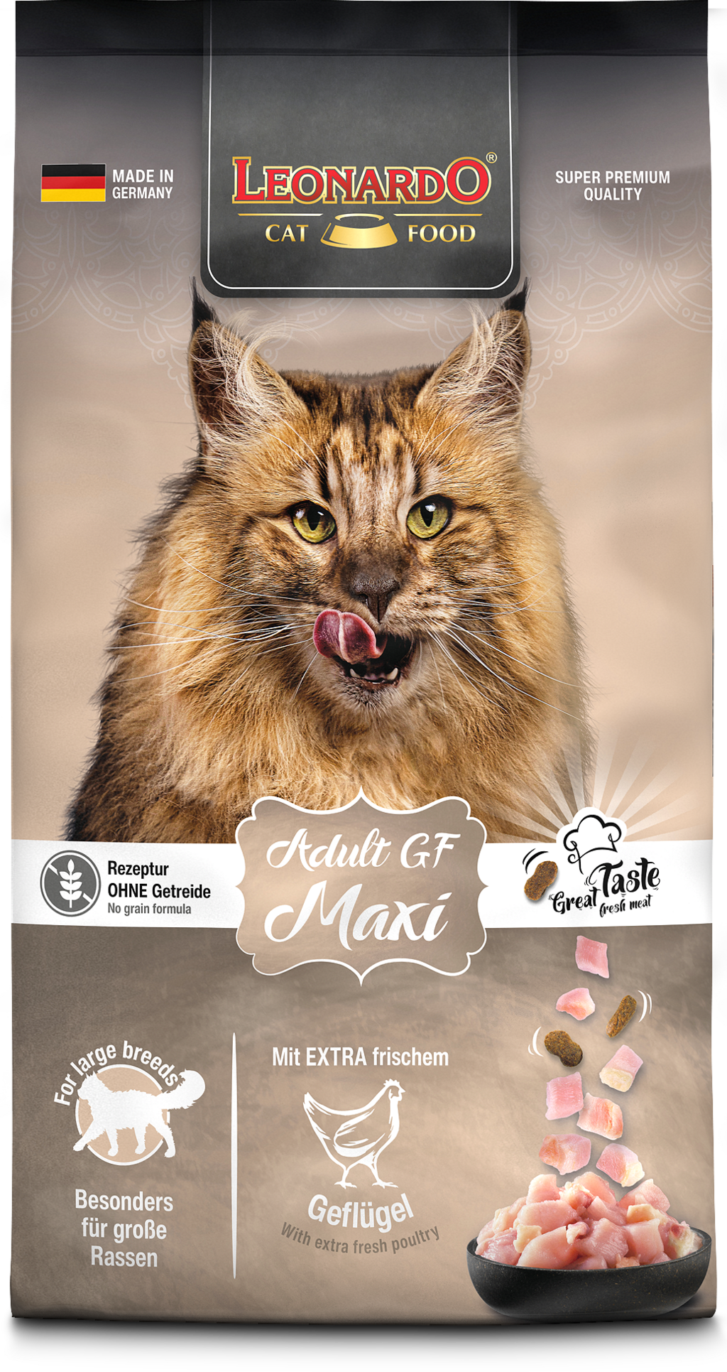 Ces croquettes sans céréales ravissent les grands amateurs de viande avec de la volaille extra fraîche. La recette est affinée avec du krill, de l'amarante et des graines de chia. Elle est également parfaitement adaptée aux besoins des chats souffrant d'intolérance alimentaire. Les grandes croquettes sont parfaites pour les grands chats !