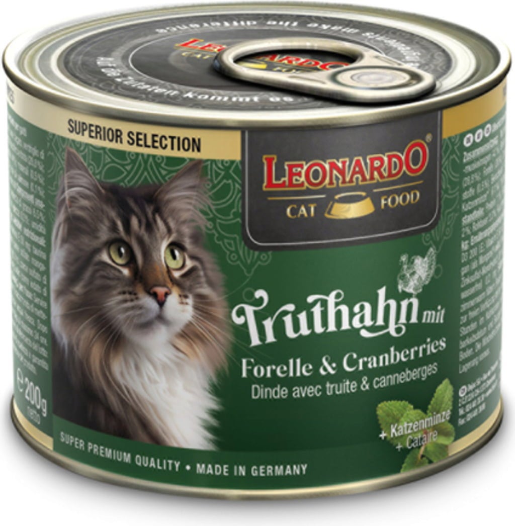 Cette pâtée pour chat de la gamme Superior Selection de Leonardo associe de précieux nutriments issus de la viande de dinde et de truite à la saveur fruitée de la canneberge. Un mélange dont votre chat tombera amoureux !