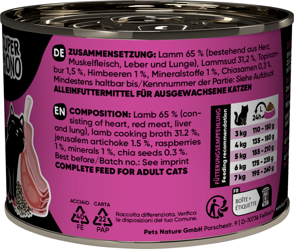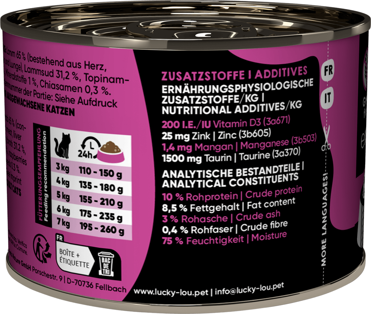 65 % agneau (cœur, muscle, foie, poumons), 31,2 % bouillon d'agneau, 1,5 % topinambour , 1 % framboises, 1 % Mineralstoffe, 0,3 % graines de chia