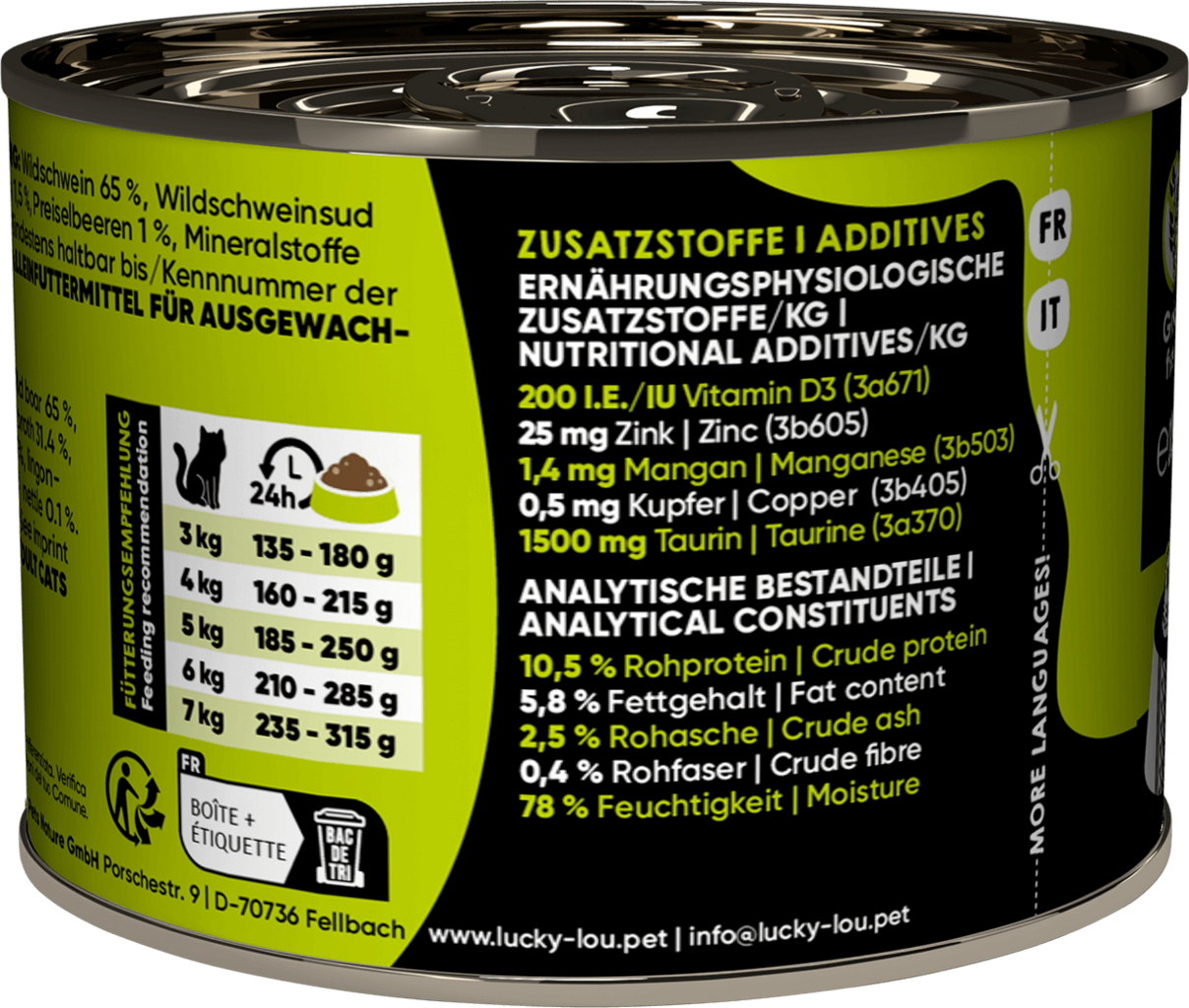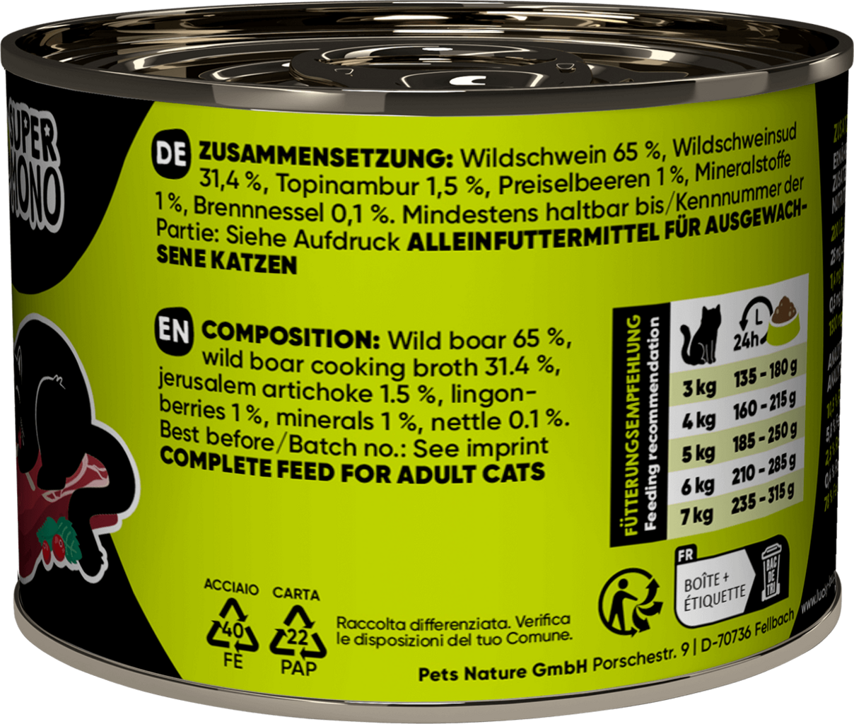 65 % sanglier, 31,4 % bouillon de sanglier, 1,5 % topinambour , 1 % canneberges, 1 % Mineralstoffe, 0,1 % ortie