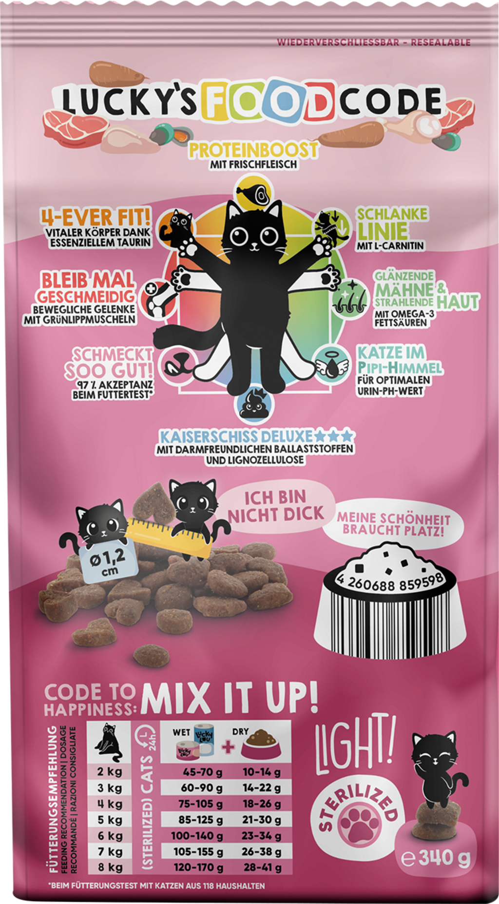 Les croquettes Food Code de Lucky Lou sont un aliment de qualité supérieure, car elles ont non seulement un goût irrésistiblement croquant et délicieux, mais fournissent également à votre chat des nutriments précieux adaptés à son âge. Inspirée des proportions parfaites de l'Homme de Vitruve de Léonard de Vinci, la recette équilibrée de ces croquettes offre 8 bénéfices par variété, qui prennent soin de votre chat de la tête aux pattes.