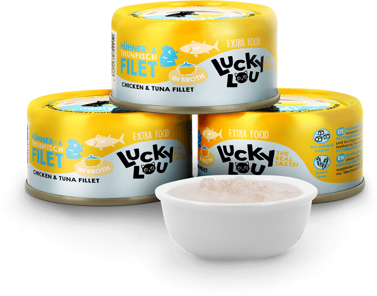 avis en français à propos du produit Lucky Lou Extra Food - Filet de Poulet et de Thon en Bouillon, en Conserve