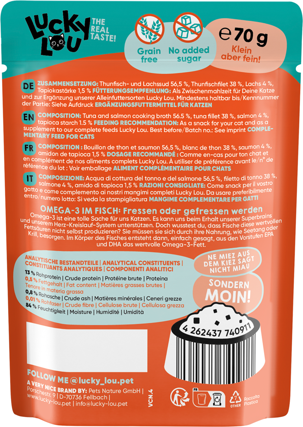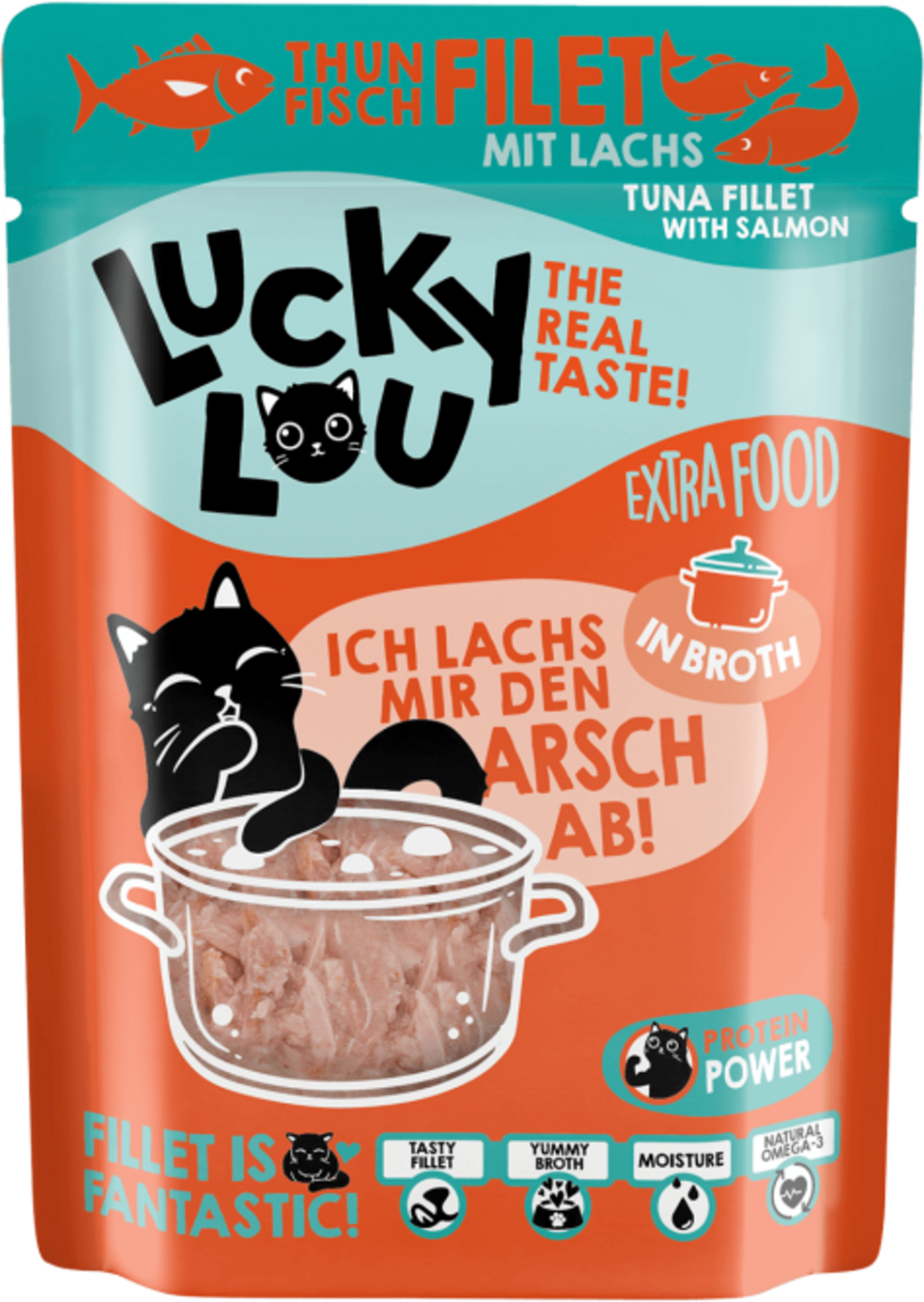 avis en français à propos du produit Lucky Lou Extra Food Pouch - Thon & Saumon dans Bouillon, Sachet