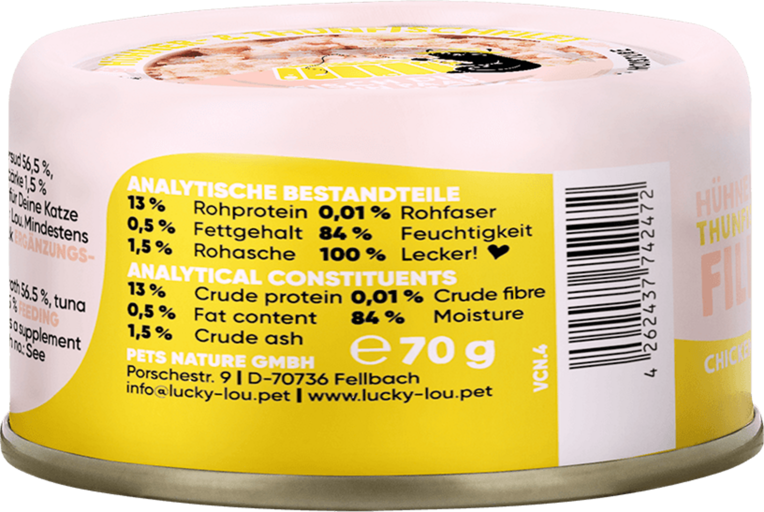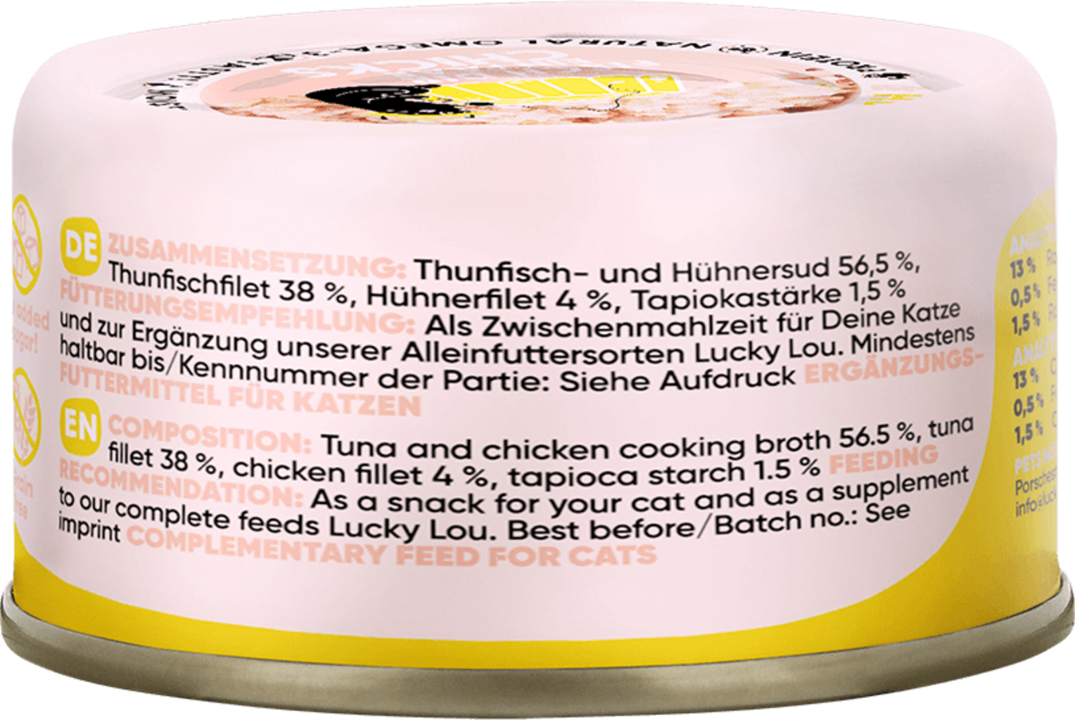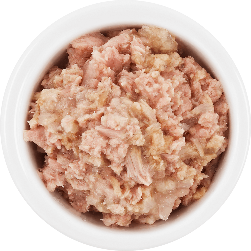 56,5 % Sud (thon, poulet), 4 % Hühnerfilet, 1,5 % amidon de tapioca