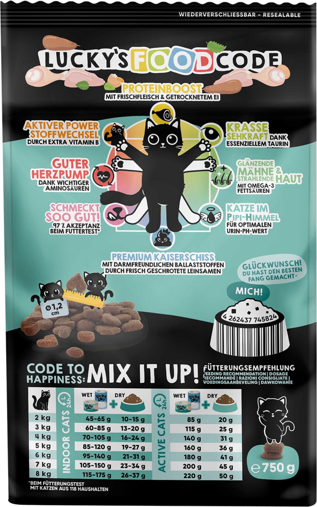 Lucky Lou Food Code est le summum des croquettes, car elles ont non seulement un goût irrésistiblement croquant et délicieux, mais fournissent également à votre chat des nutriments précieux adaptés à son âge. Inspirée des proportions parfaites de l'Homme de Vitruve de Léonard de Vinci, la recette équilibrée de ces croquettes offre 8 bénéfices par variété, qui prennent soin de votre chat de la tête aux pieds.