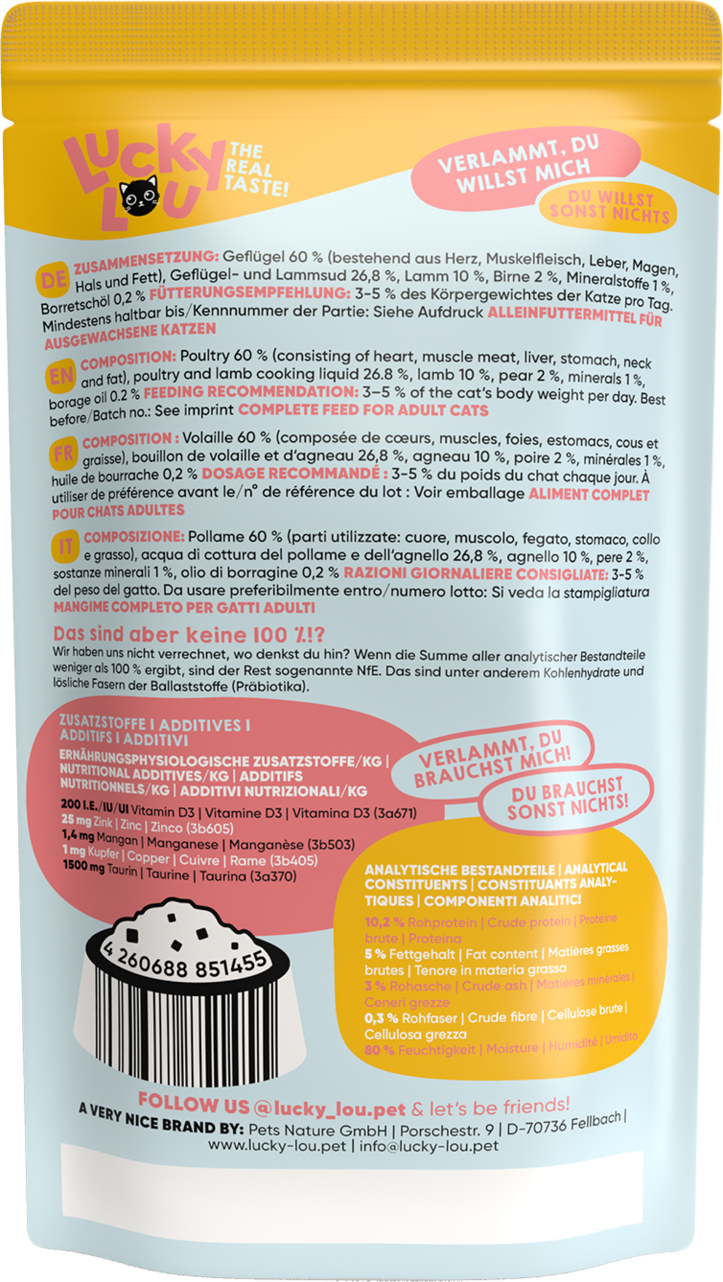 Pâtée Lifestage Pouch Adult Volaille & Agneau de Lucky Lou