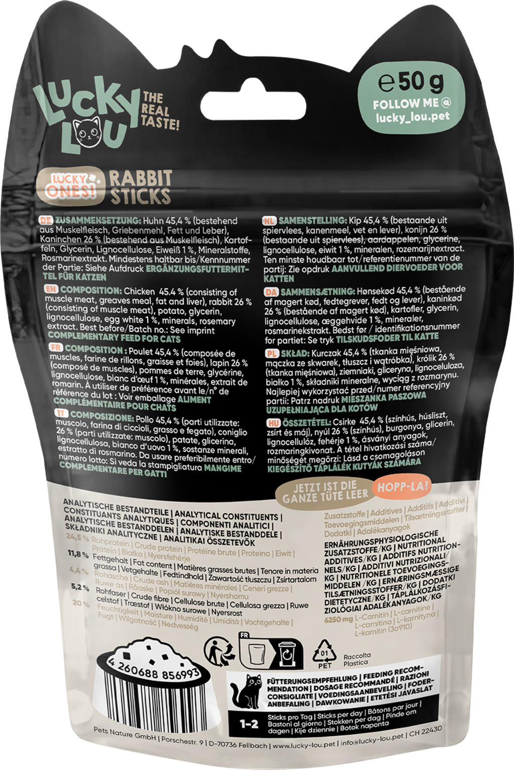 45,4 % poulet (muscle, Griebenmehl, graisse, foie), 26 % lapin (muscle), pommes de terre, Glycerin, Lignocellulose, 1 % Eiweiß, Mineralstoffe, extrait de romarin