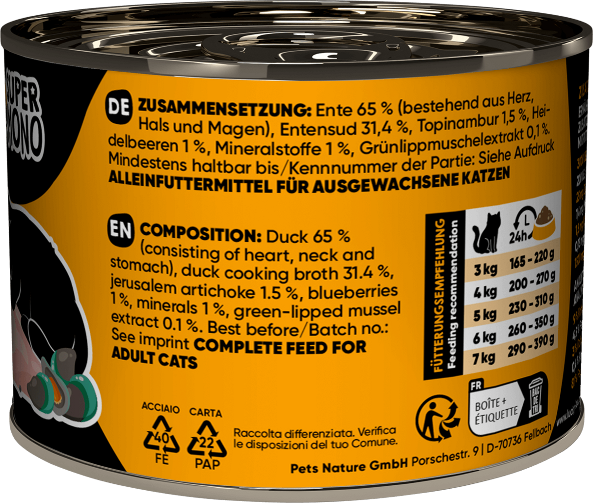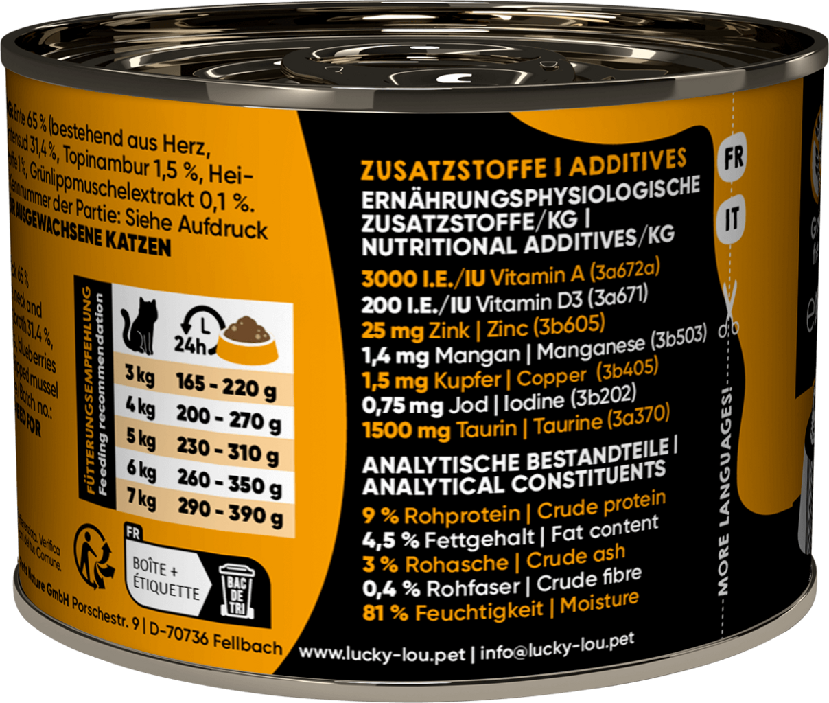 65 % canard (cœur, cou, estomac), 31,4 % bouillon de canard, 1,5 % topinambour , 1 % myrtilles, 1 % Mineralstoffe, 0,1 % algues