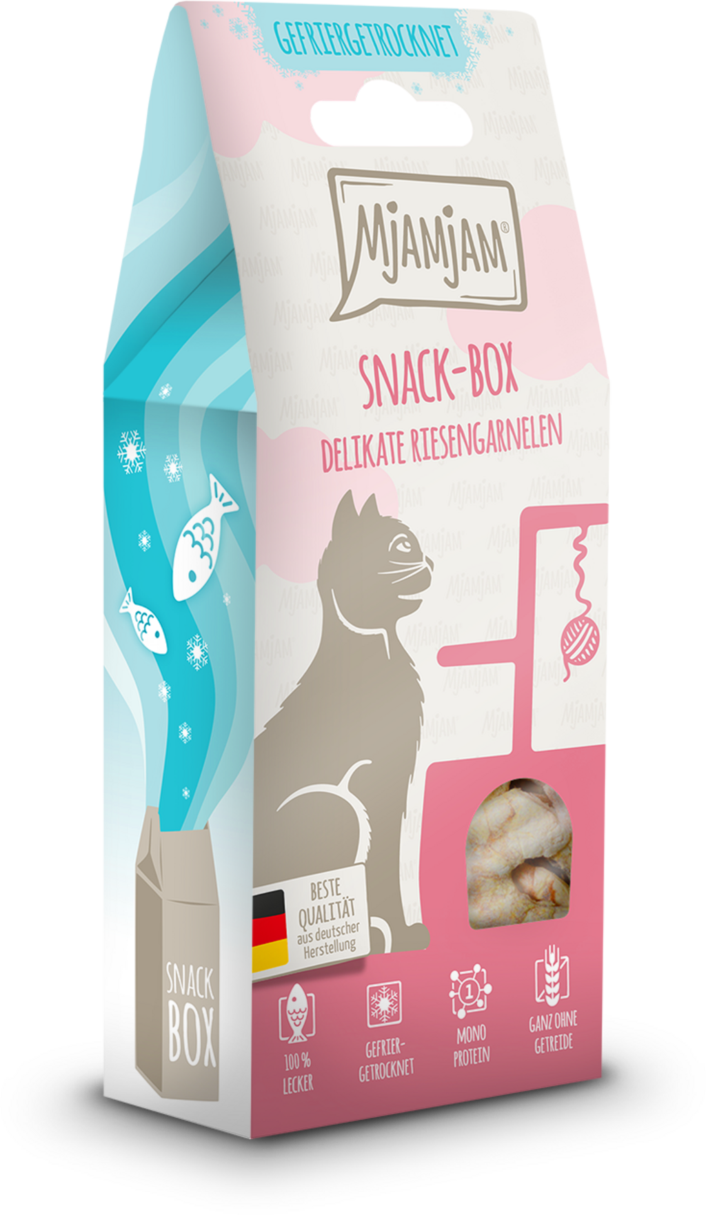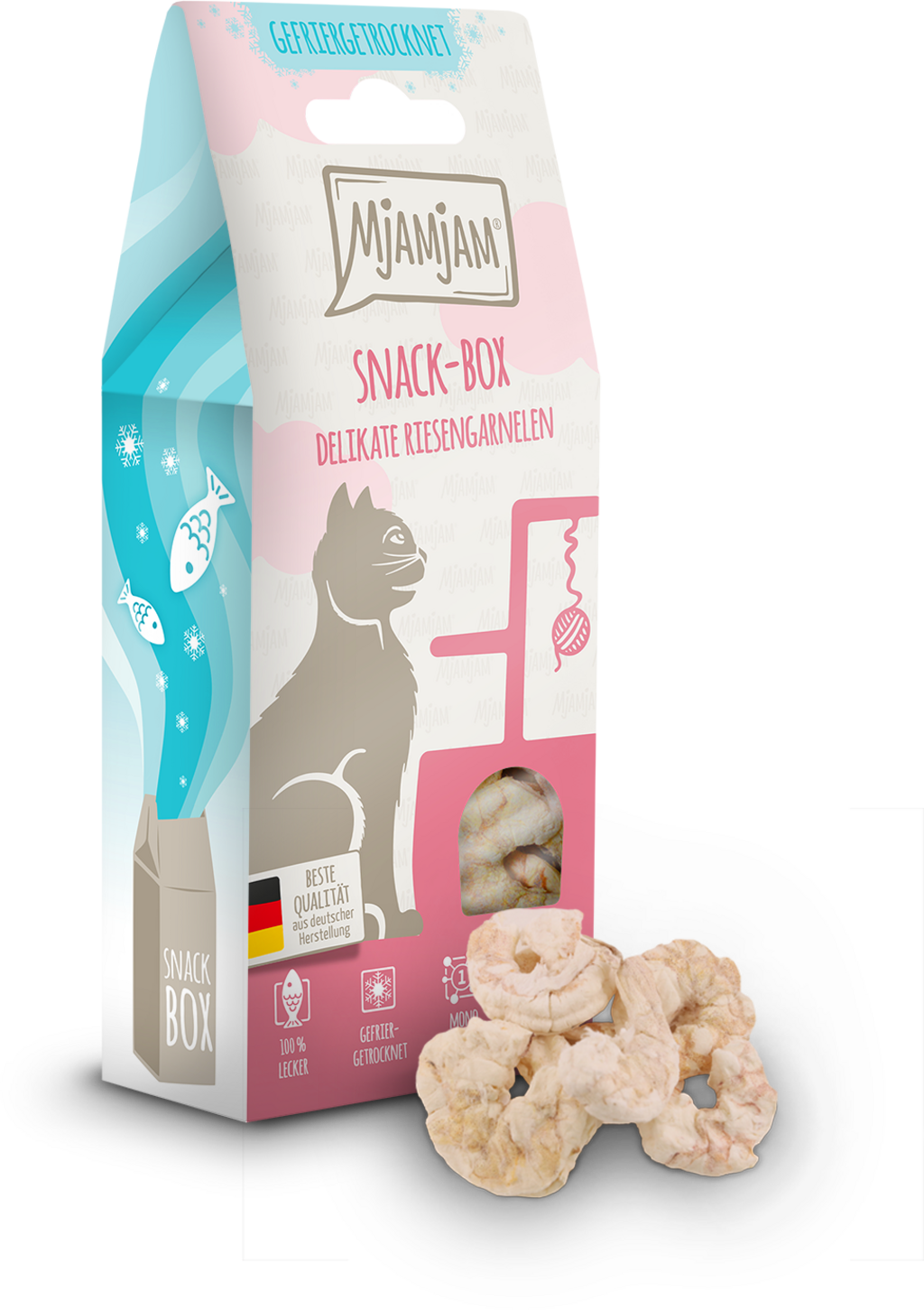 Les friandises de la Snackbox de Mjamjam sont la récompense idéale pour votre chat et une excellente façon de lui faire plaisir. Préparée avec de grosses crevettes fraîches, délicatement lyophilisées, la Snackbox offre une gourmandise naturelle qui saura ravir votre chat.