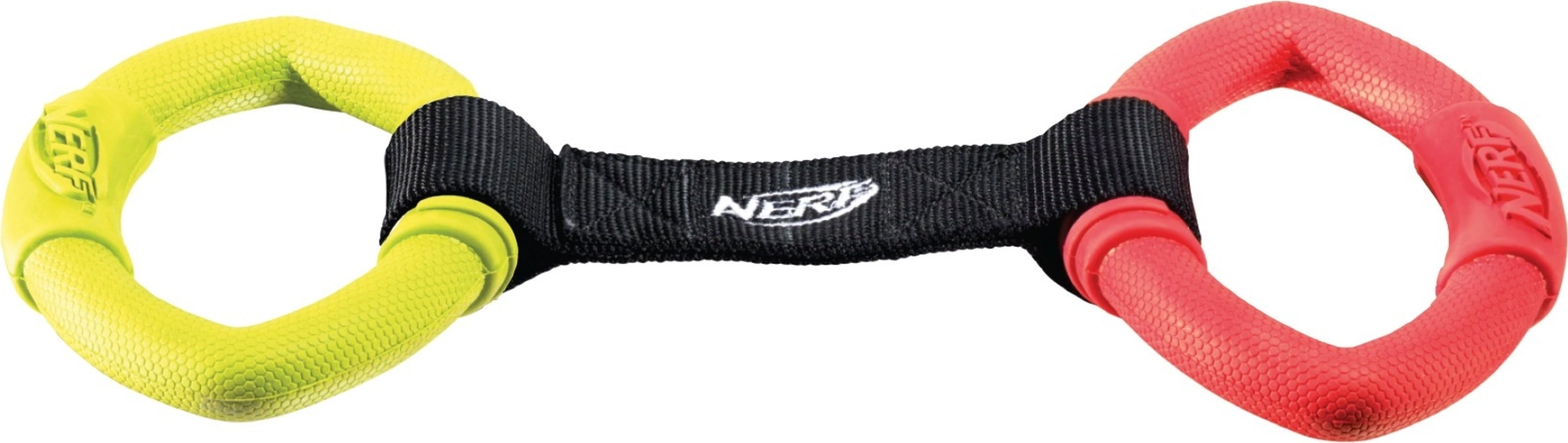 Jouet tug multicolore pour des heures de jeu : ces deux anneaux en caoutchouc très résistant sont reliés par une sangle robuste en nylon. Un jouet qui résistera à bien des épreuves !